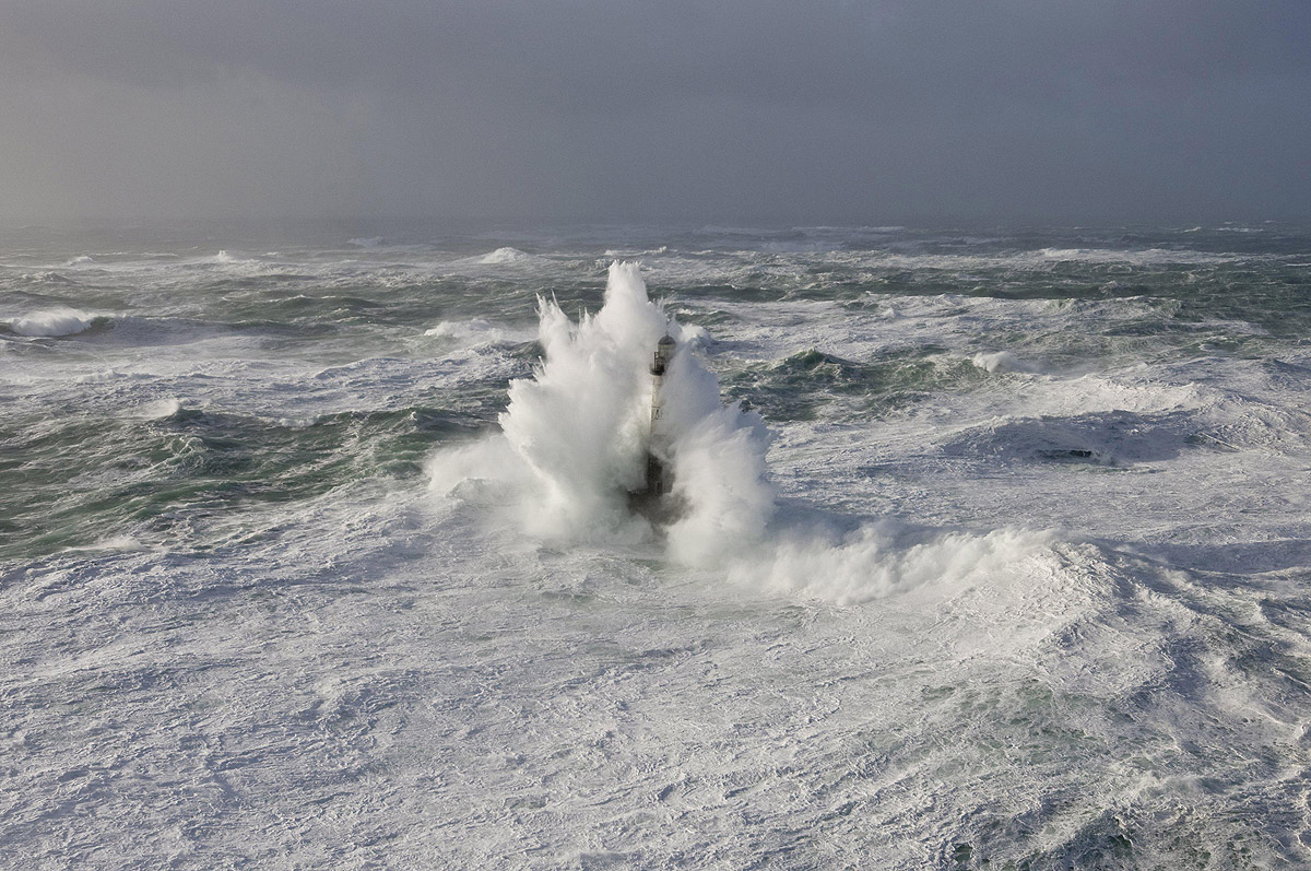 El faro en la imagen, situado en Finistère, en la Bretaña francesa, tiene 37 metros de altura, lo que nos da una idea de la magnitud y la violencia de las olas que impactaban contra él en diciembre de 2007