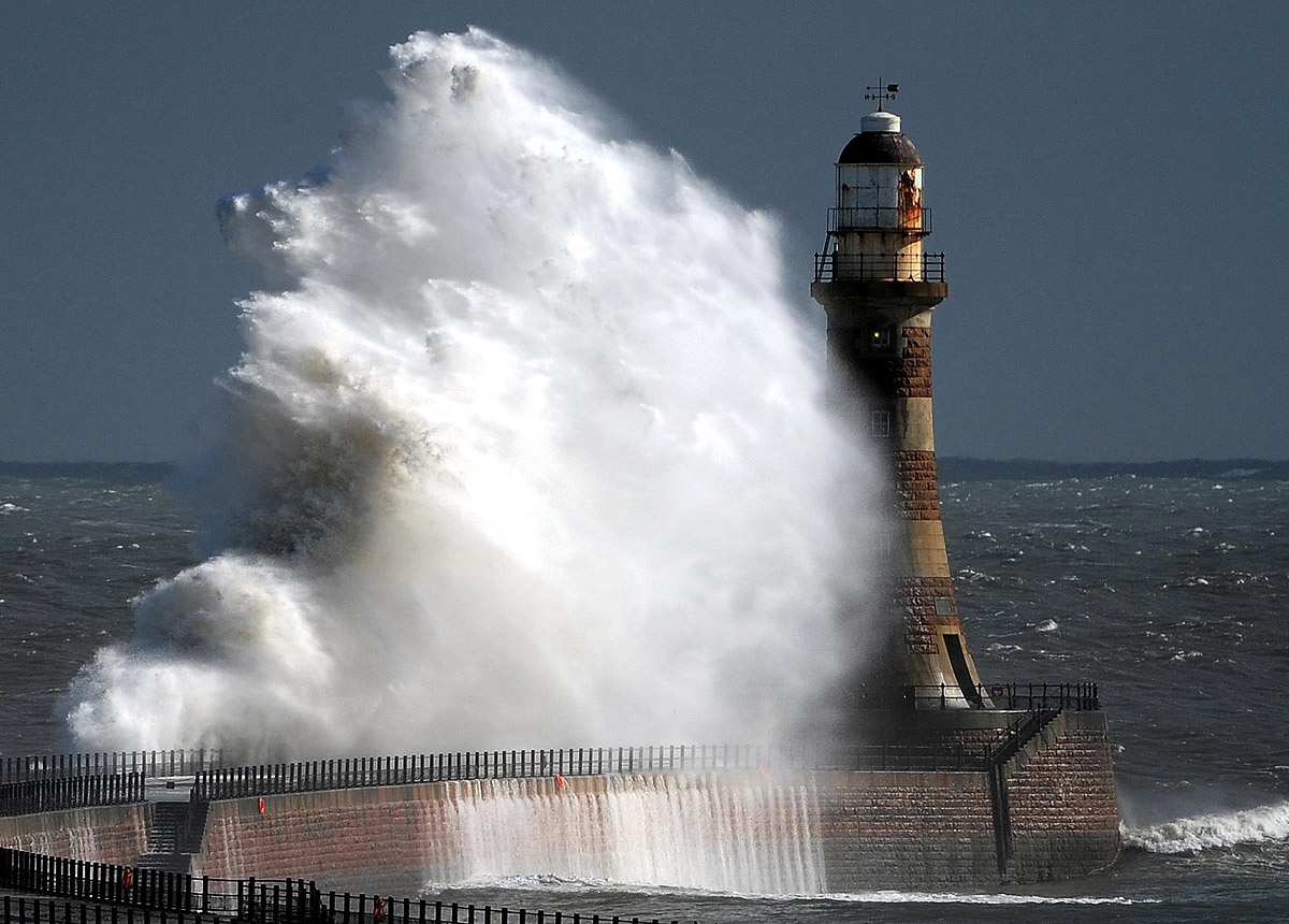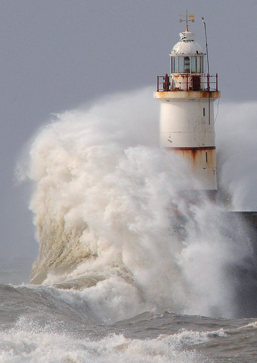 Al norte de Inglaterra, los 42 metros del faro del puerto de Sunderland, en Tyne and Wear, lleva 110 años resistiendo olas como las que lo golpean en esta imagen de septiembre de 2010