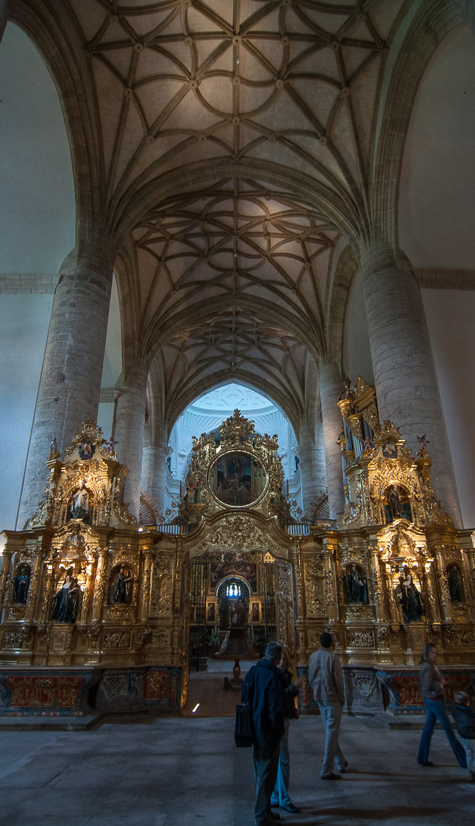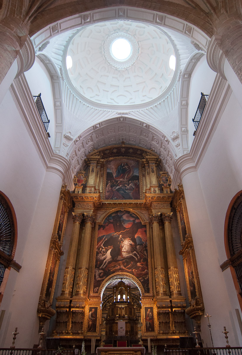 El altar mayor de la iglesia. Aunque la imagen del santo con un caballo blanco presentando batalla a los moros solemos asociarla con Santiago, lo cierto es que el protagonista de ésta es San Millán, que supuestamente se apareció en la batalla de Simancas