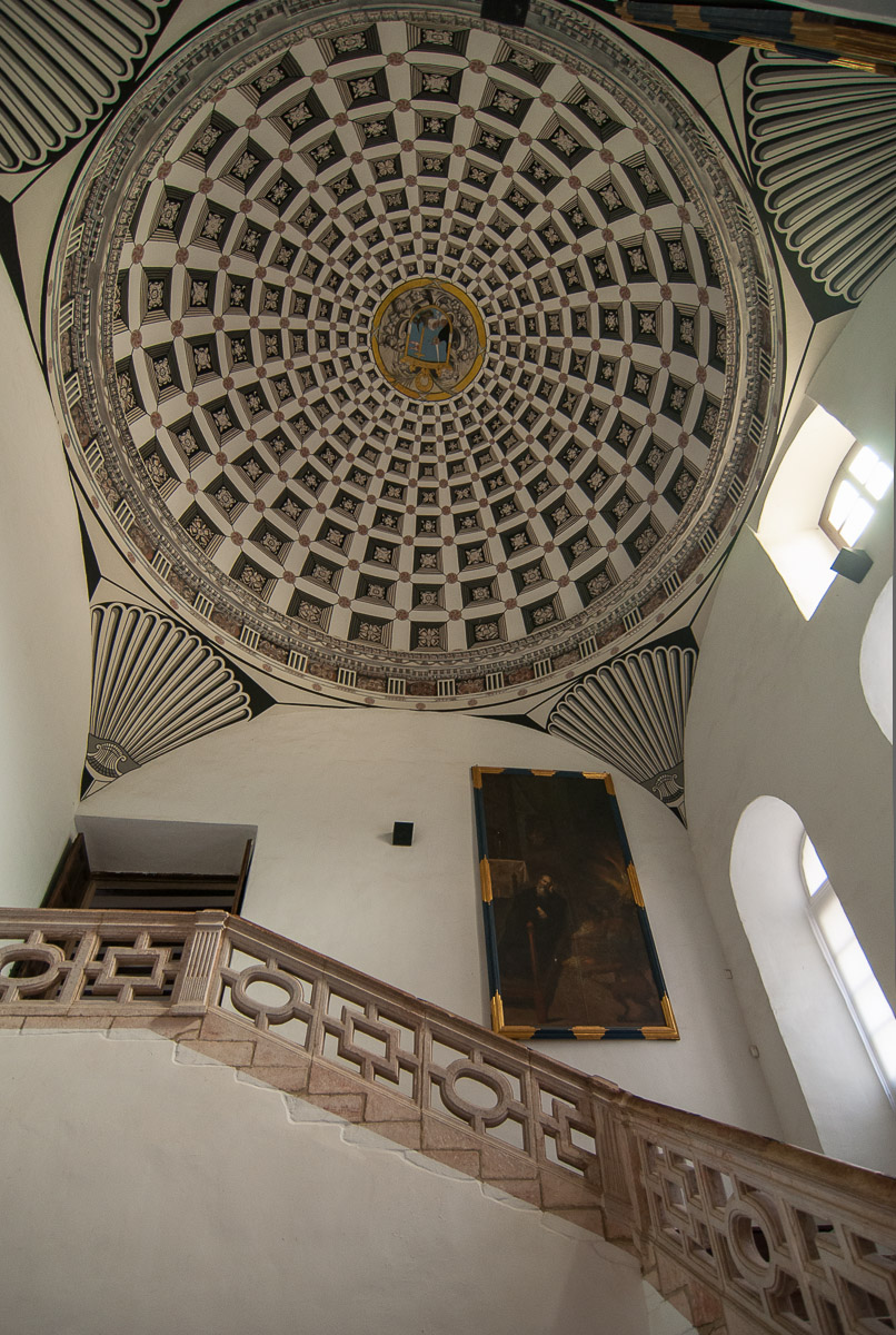 Una de las escaleras principales del monasterio, coronada por una llamativa cúpula pintada