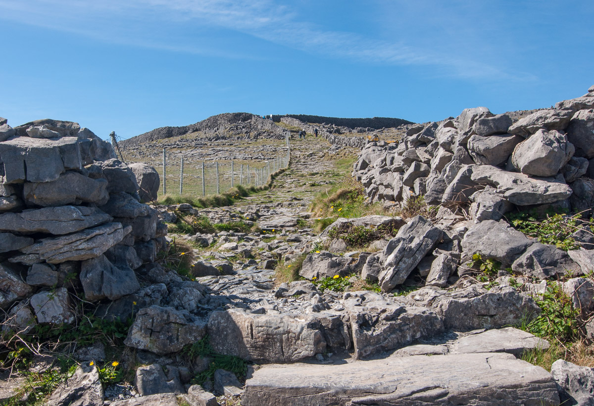 La parte final del camino, más pedregoso y convertido casi en una escalera, nos lleva a la primera muralla de Dún Aengus