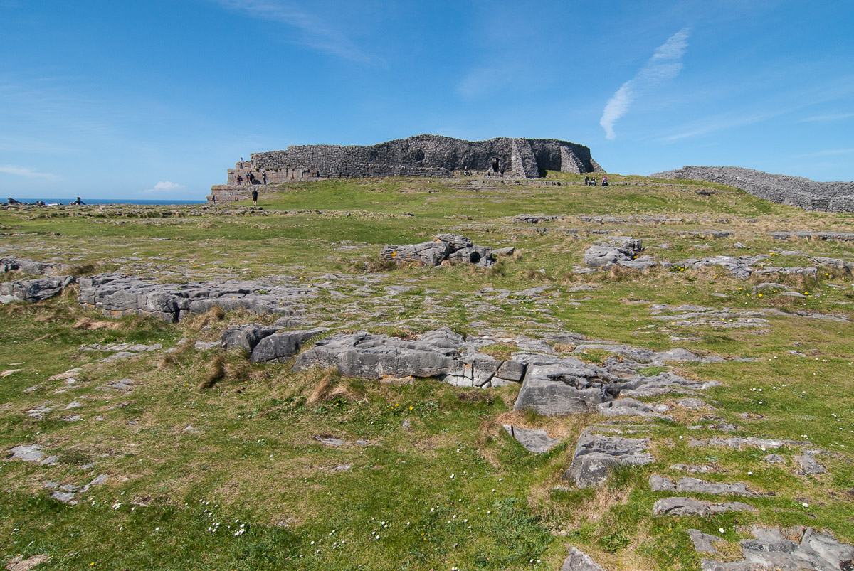 El camino para llegar a Dún Aengus, desde la salida del fuerte. Al fondo el océano y la costa de Irlanda