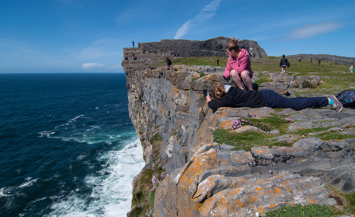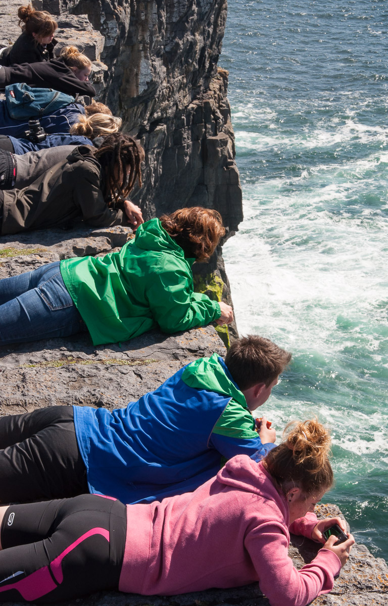 Casi como si de una tradición se tratara, los visitantes se tumban en el borde del acantilado a contemplar la impresionante caída