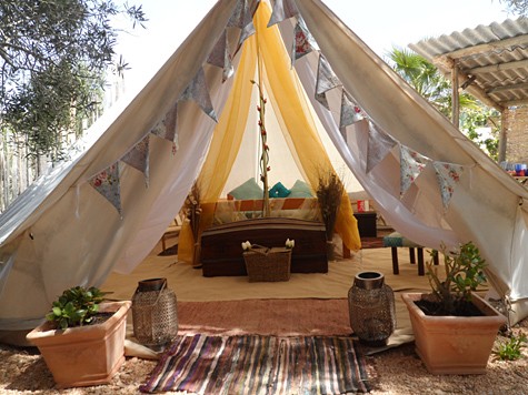 Este camping ecologista ofrece tipis americanos y tiendas de inspiración africana a sus huéspedes. En la tienda hay espacio para hasta 7 personas, con sofás y camas. Fuera encuentran el resto de comodidades.
