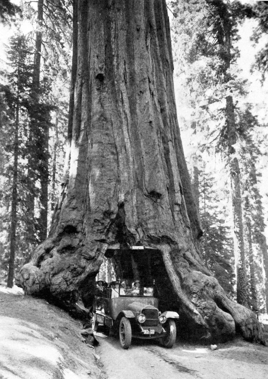 Otro de los árboles estrella de Yosemite era el Wawona. Fascinados por su enorme tamaño, decidieron construir un túnel para atravesar el tronco en 1881 -la imagen, de 1923, da una idea de su tamaño-. El árbol, sin embargo, no lo resistió.