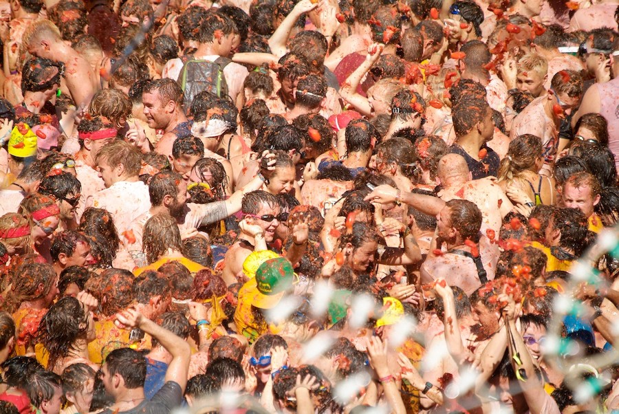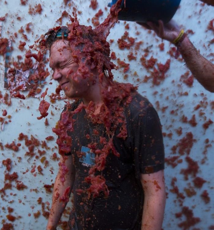 Unas 22.000 personas han participado este miércoles en la fiesta de la Tomatina, una guerra a tomatazos en la que se lanzan durante una hora 130.000 kilos de tomate por las calles de la pequeña localidad española de Buñol (Valencia)