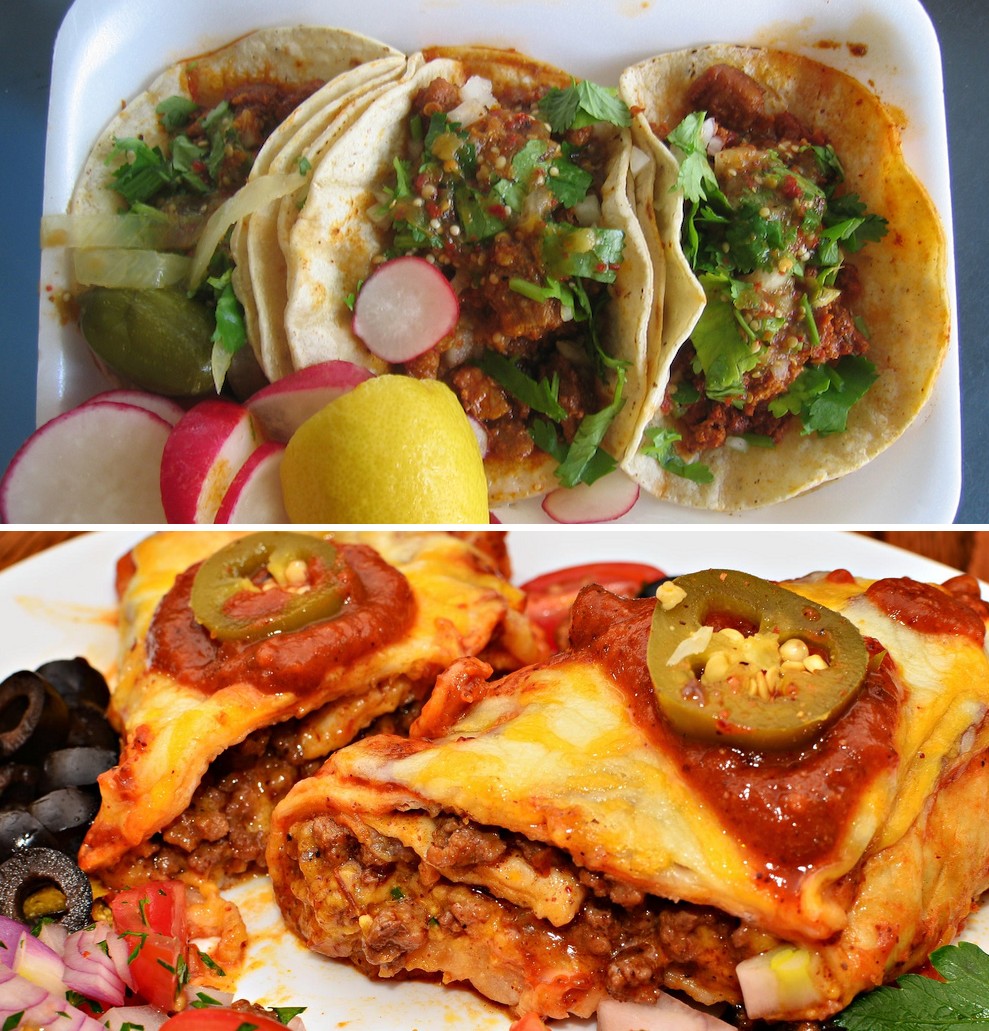 En este listado no podía faltar una de las cunas del picante: México. Los tacos y las enchiladas son los platos tradicionamente más picantes de los que se elaboran en este país. Se preparan con las tradicionales tortillas de maíz. Se emplean diferentes carnes, quesos y judías o frijoles. El chile es el ingrediente que no puede faltar. Dependiendo de la variedad de chile que se utilice se regula el nivel de picante de estos platos. En esta categoría también se puede incluir los burritos. Dentro de esta categoría existe el burrito suicida, que lleva pimientos chinos, mexicanos y también coreanos