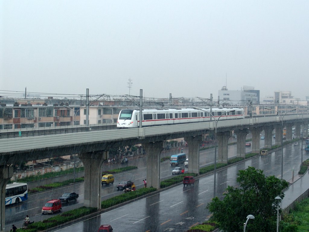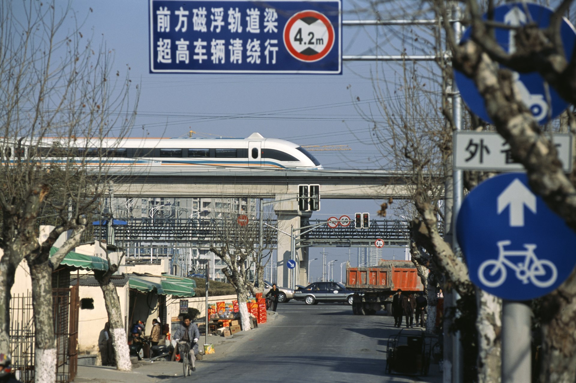 La práctica totalidad de esta futurista línea ferroviaria, en concreto 29,9 kilómetros, es elevada. Es el único tren de levitación magnética de alta velocidad que funciona en el mundo, habiendo alcanzado un récord de 501 km/h, y conecta el centro de la ciudad con el aeropuerto internacional de Pudong con un trayecto que dura quince minutos. Un gran éxito técnico que no ha tenido el éxito comercial esperado desde su inauguración en 2004.
