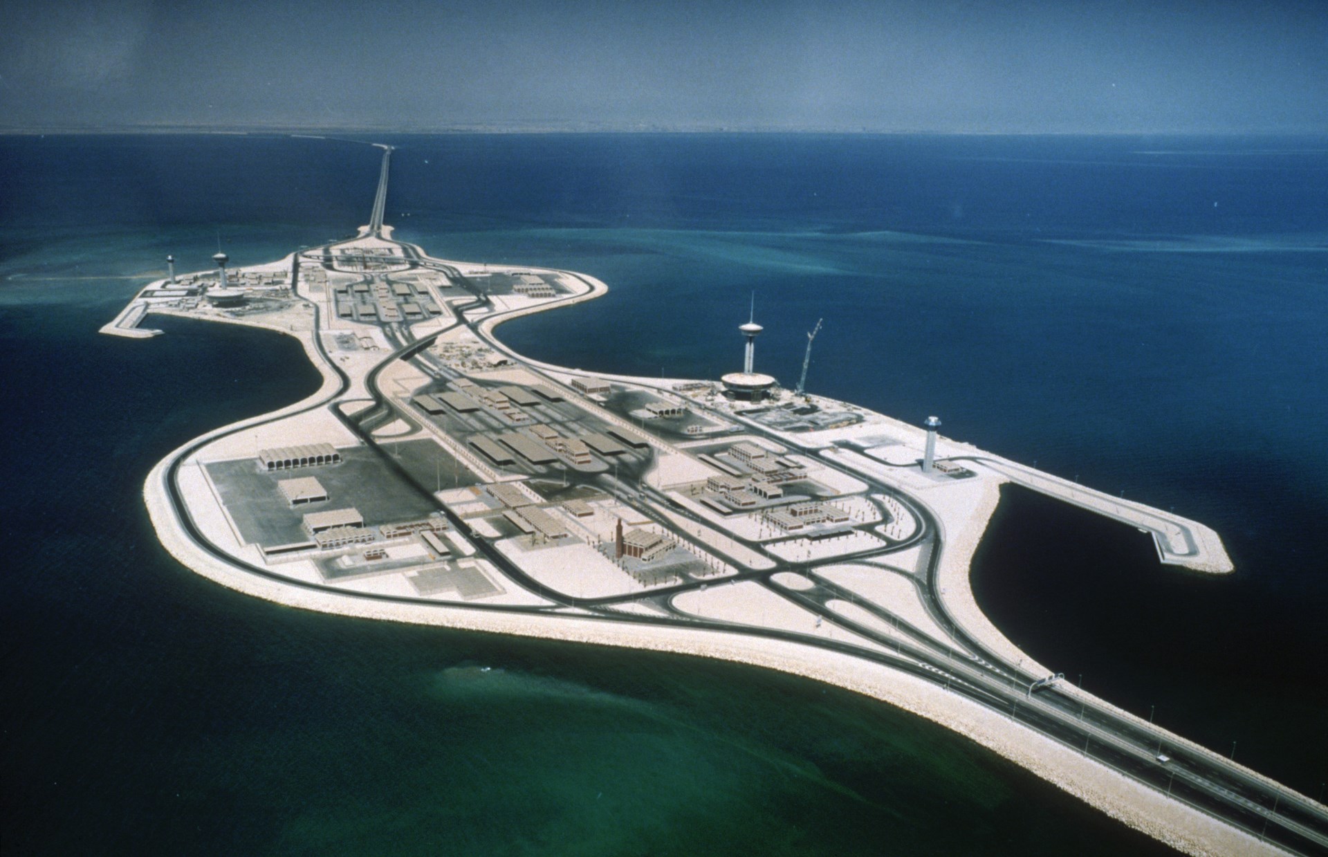 Este puente de 25 kilómetros conecta Arabia Saudí con Baréin a través de la isla intermedia de Umm an Nasan y otra isla artificial, en la foto, que sirve de frontera y control de pasaportes. Fue construido entre 1983 y 1986.