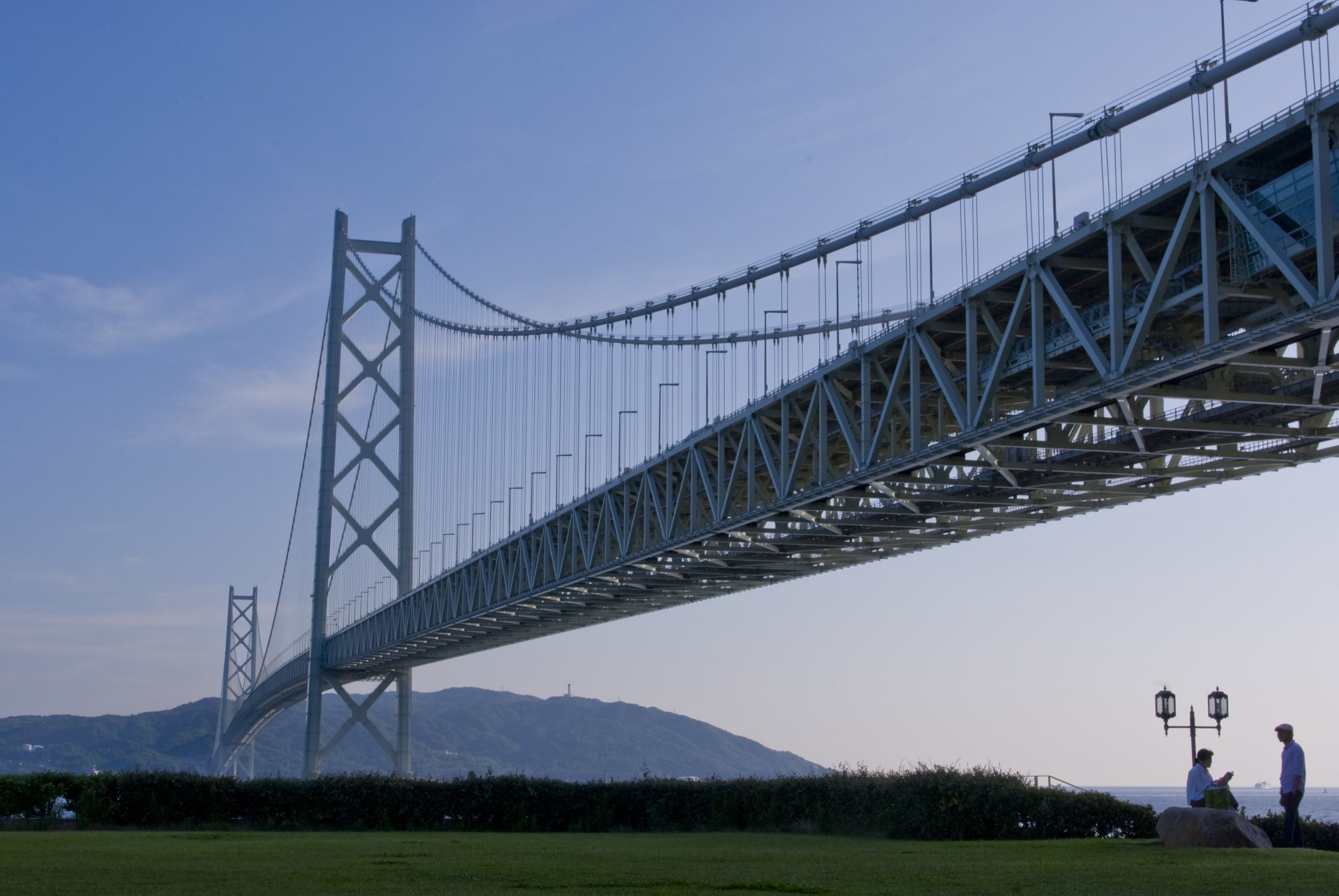 Aunque sin duda el puente de este tipo más famoso es el Golden Gate de San Francisco, el más largo une Kobe con la isla de Awaji en Japón y mide 3,9 kilómetros. Su vano central es de 1,9 kilómetros y está soportado por cables de 112 centímetros de diámetro formados por 37.000 alambres de acero. Algo necesario, porque los tifones en la zona pueden alcanzar los 290 km/h. Su construcción duró diez años, entre 1988 y 1998, y tuvo que rediseñarse después de que un terremeto en 1995 moviera las torres, que ya estaban construidas.