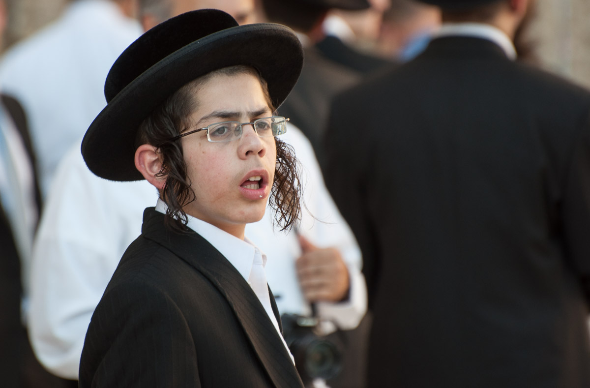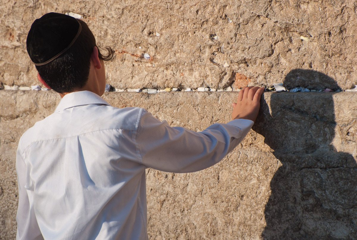Un niño reza junto a la roca, vestido de una forma que lo identifica como judío ortodoxo
