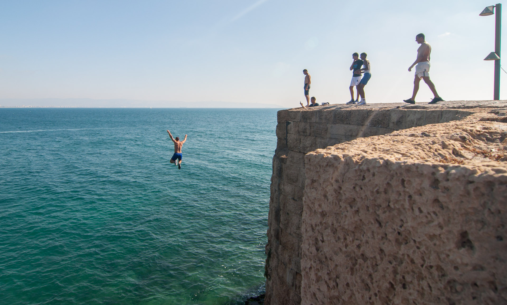 Un grupo de jóvenes saltan desde lo alto de la muralla al mar
