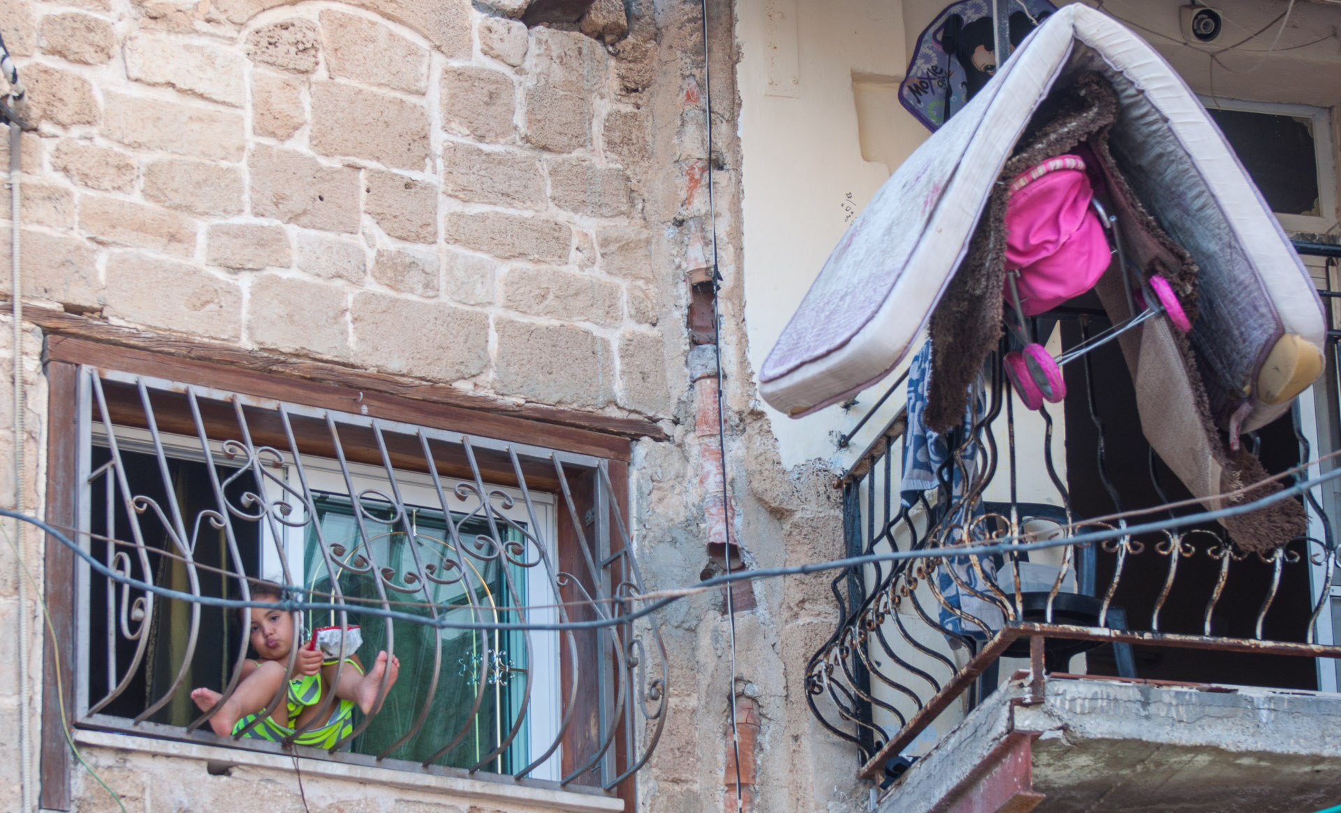Una niña pequeña contempla la calle desde una ventana enrejada y junto a un balcón en el que se acumulan objetos de lo más variados