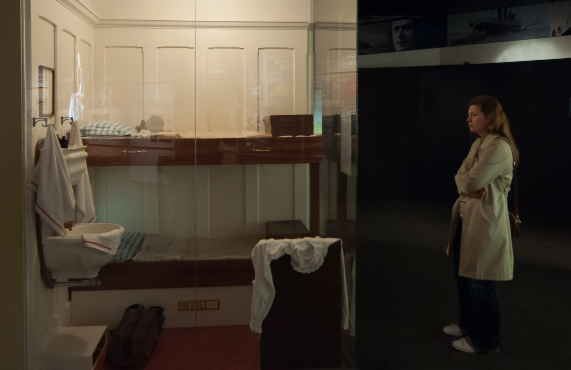 Una visitante contempla la reconstrucción de los camararotes de las clases inferiores