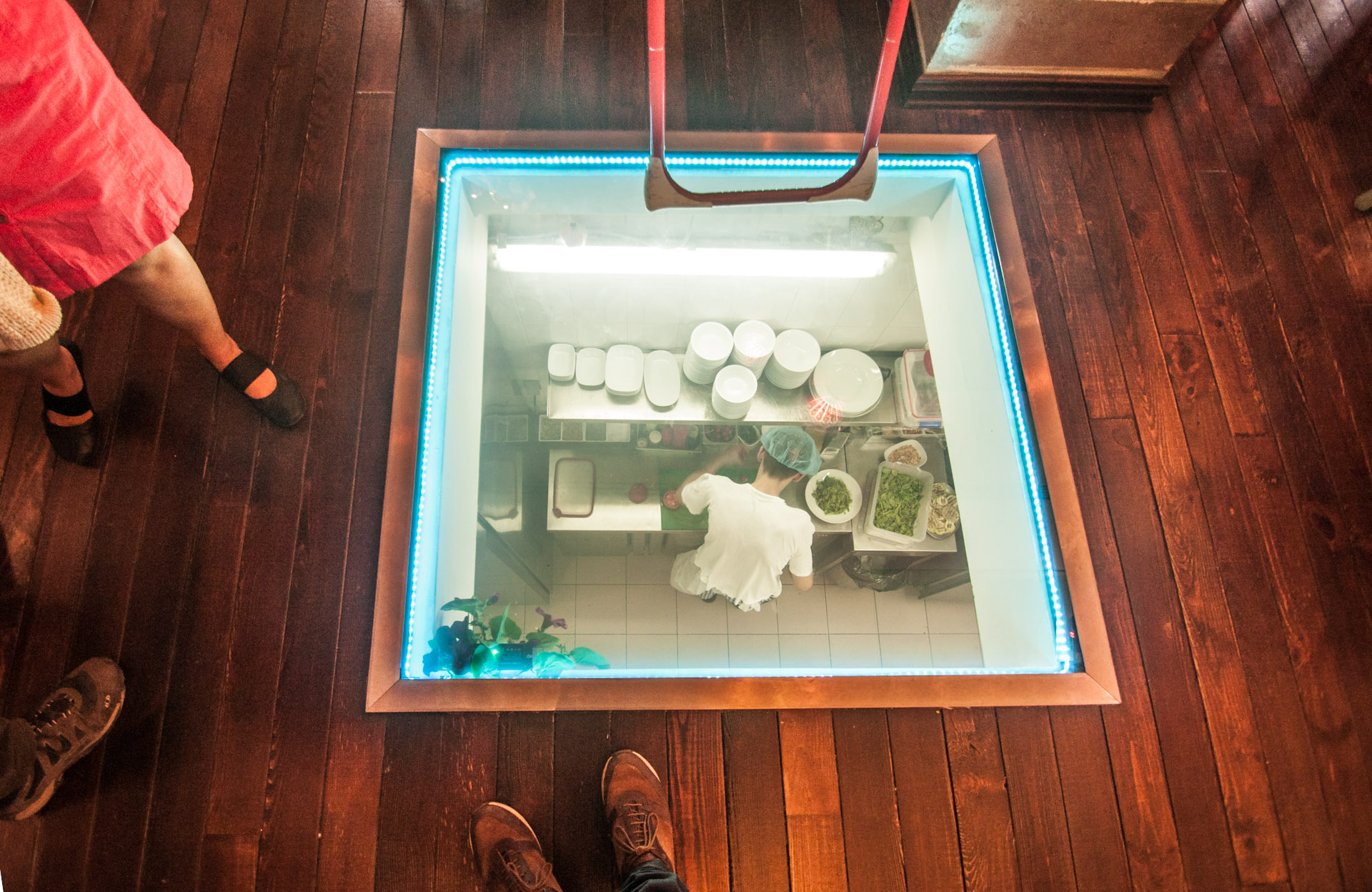 Bajo el suelo de este restaurante es posible esperar el pedido viendo todo el proceso de preparado.