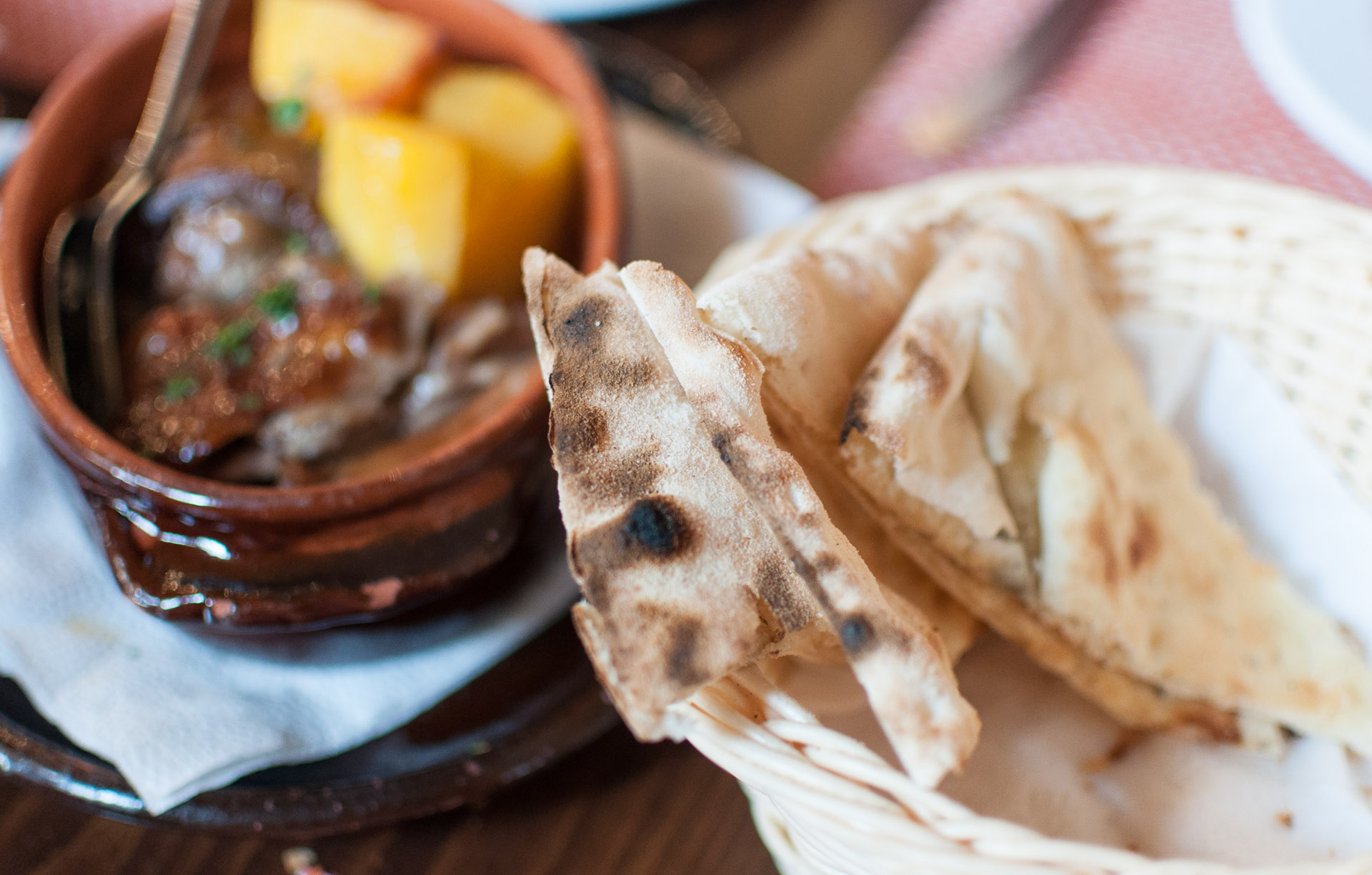 El cordero es un plato fundamental en la cocina serbia. Acompañado en este caso de una ración de pan de pita.