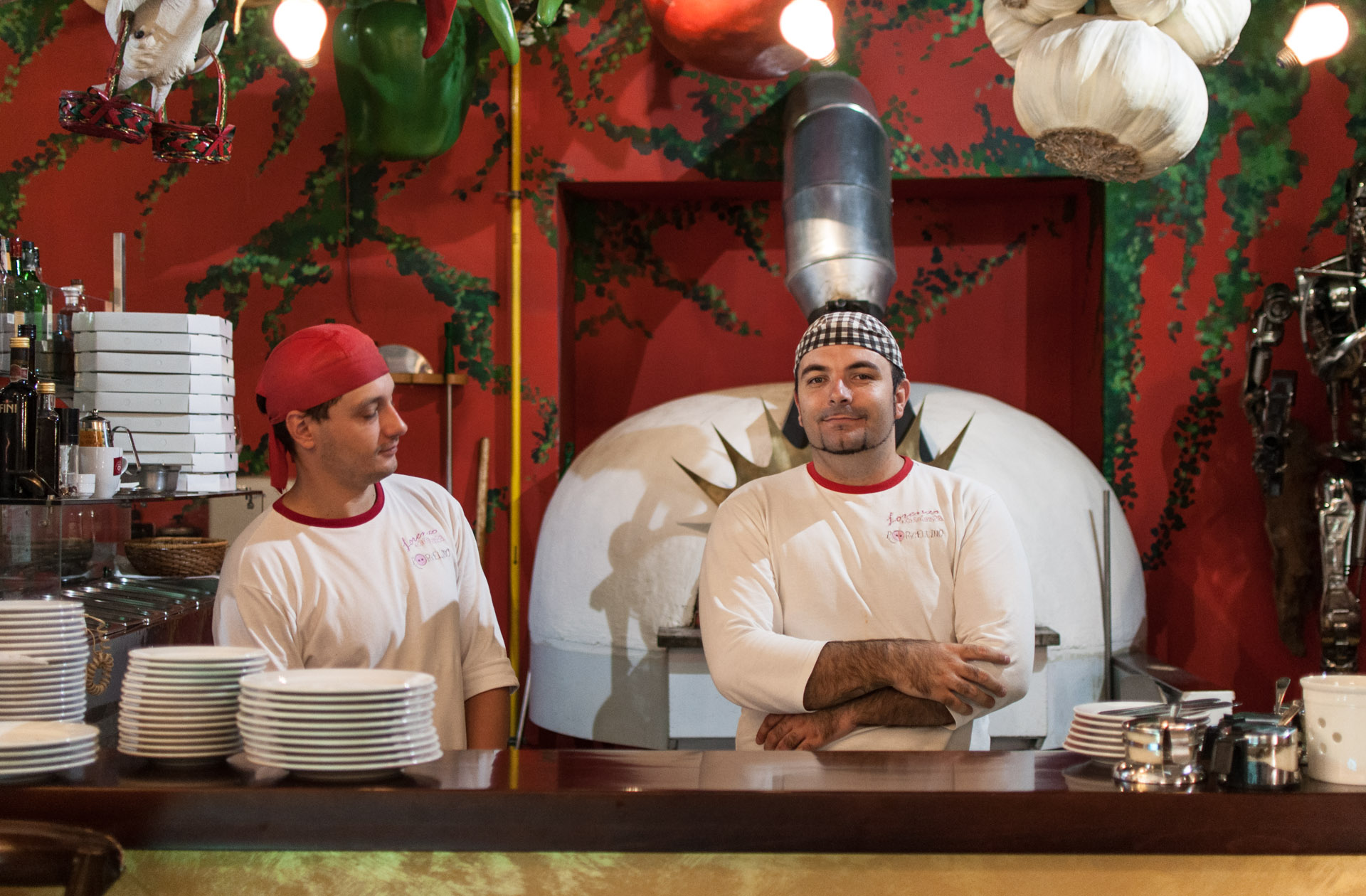 Dos de los cocineros del restaurante, decorado con los ingredientes de su cocina pero en tamaño gigante.