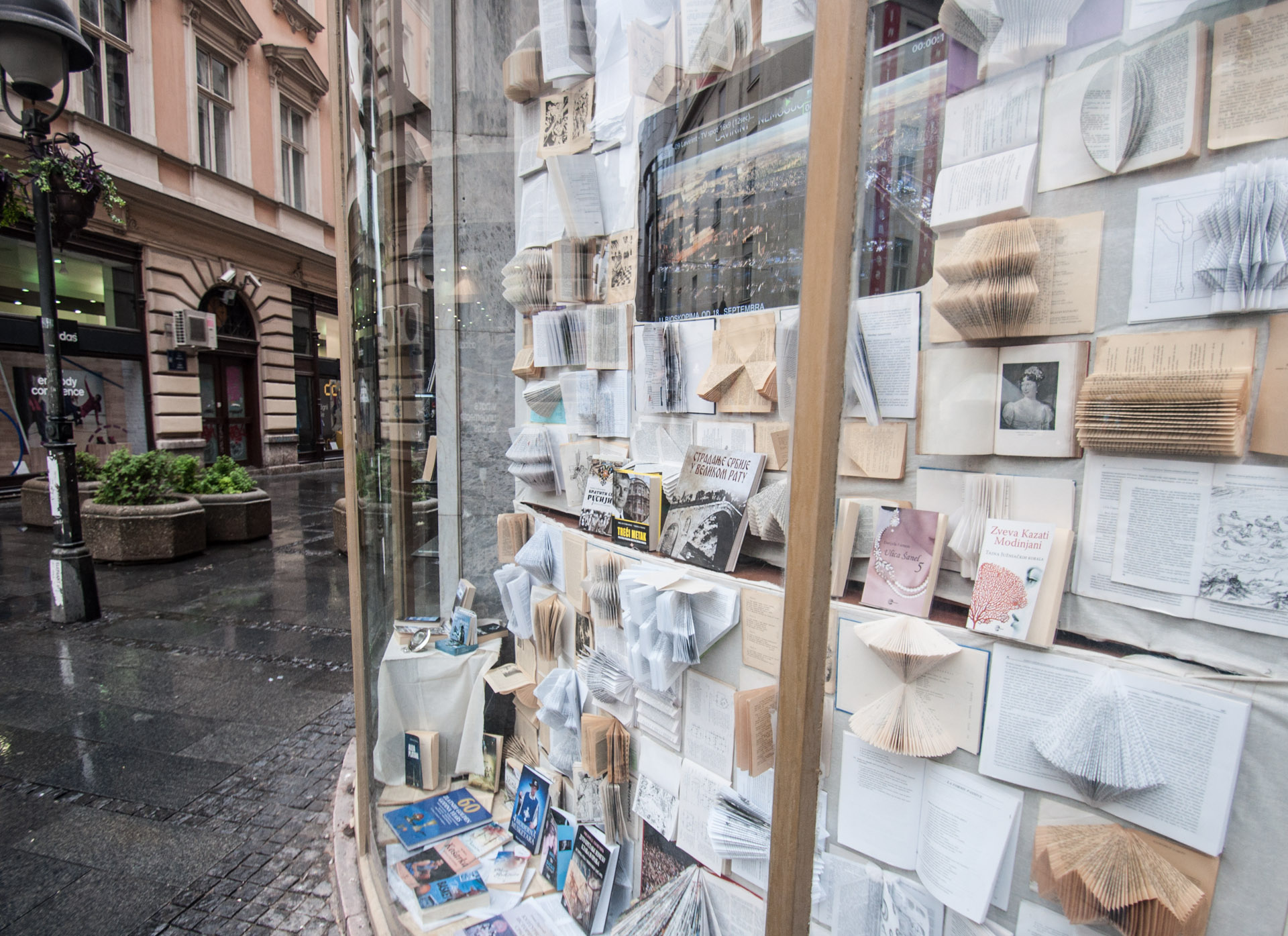 El curioso escaparate de una librería en plena calle Knez Mihailova muestra los libros abiertos y con diferentes formas.