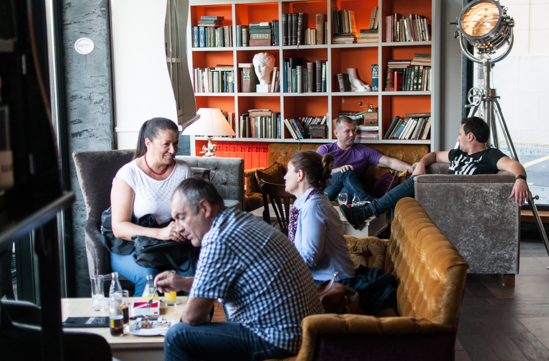 El interior del acogedor y tranquilo cafe Ceger Kade, con unas bonitas vistas a la catedral de San Sava.
