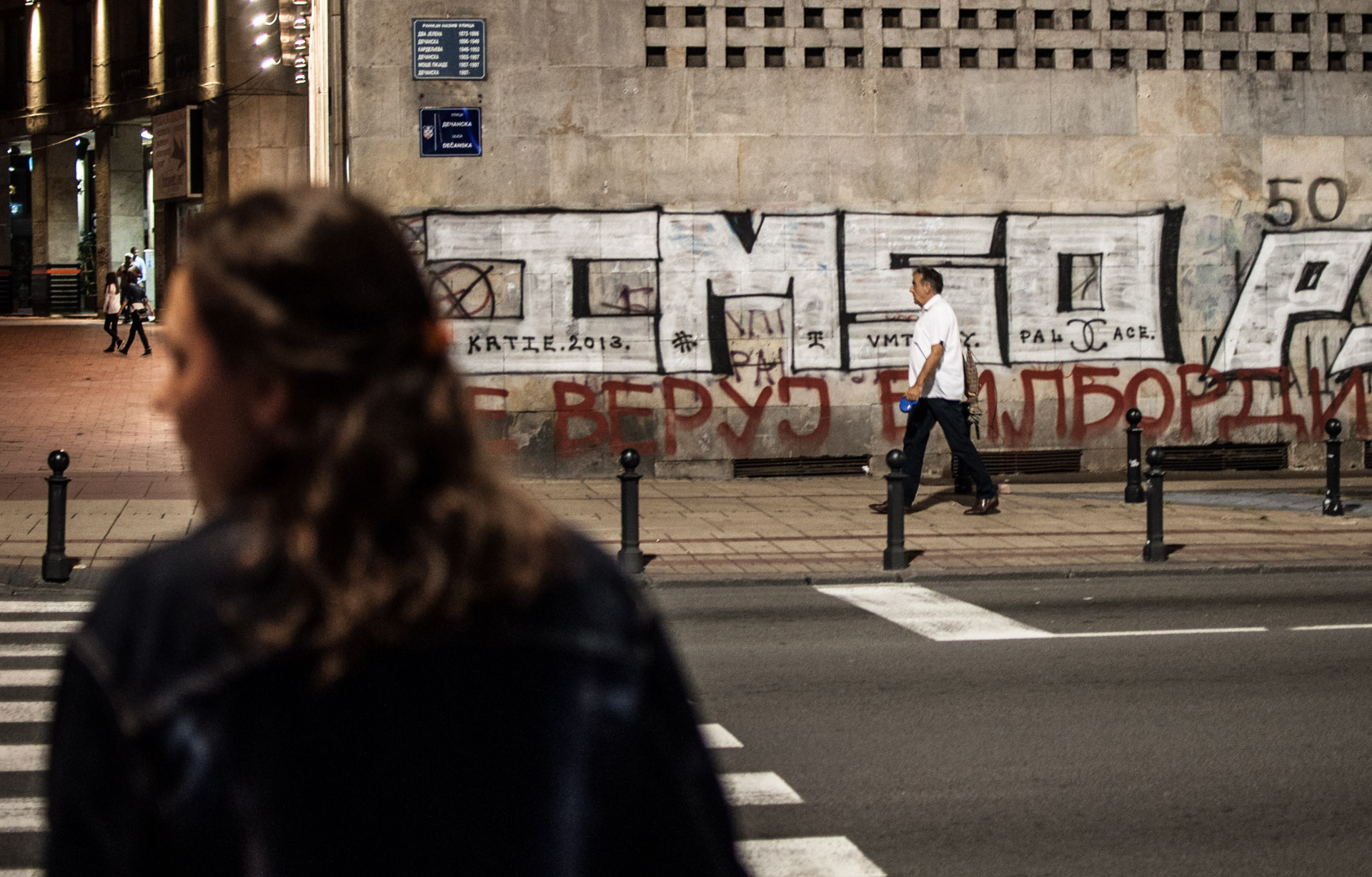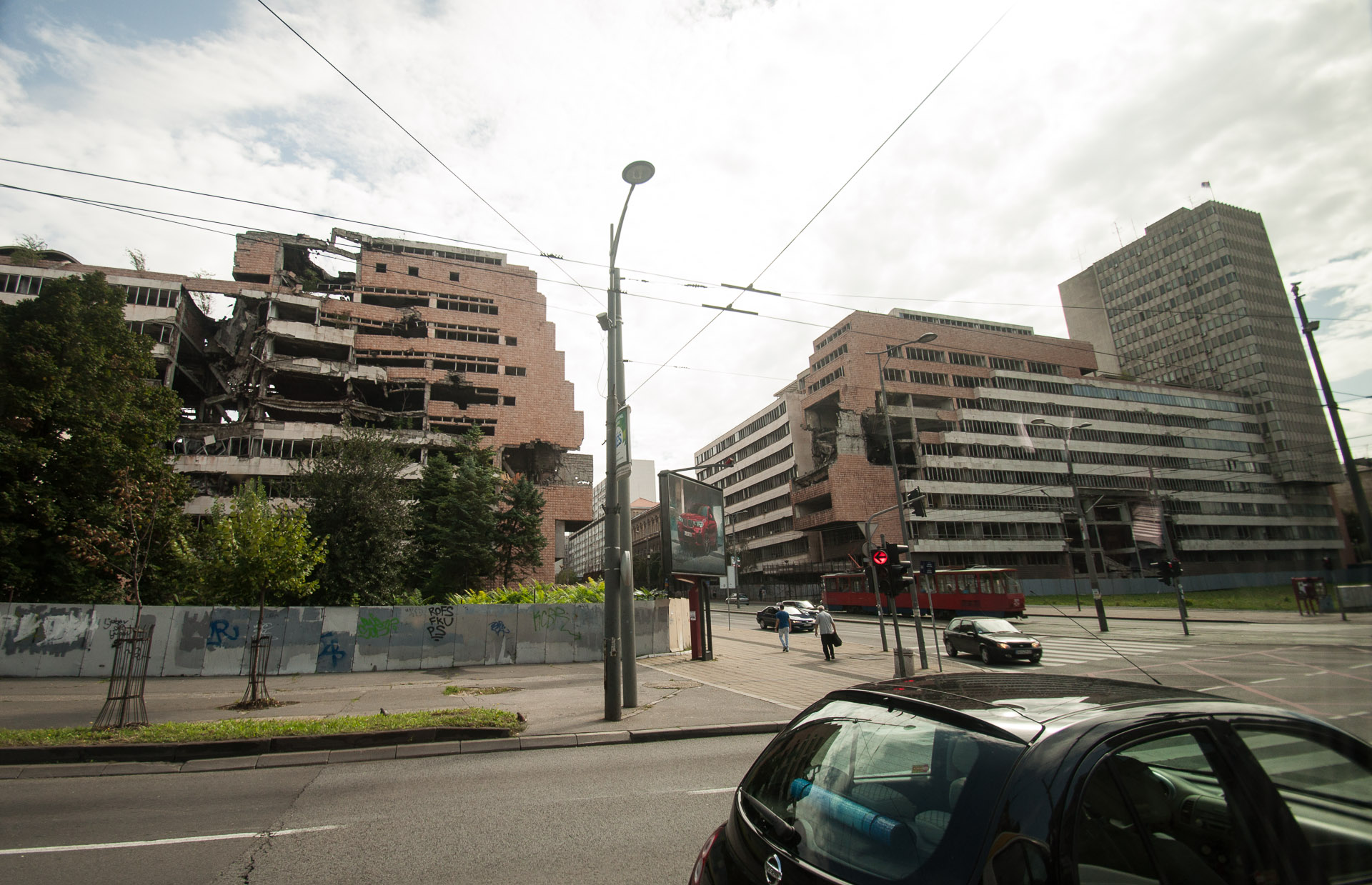 El recuerdo de los bombardeos de la OTAN en lo que queda del antiguo edificio del Ministerio de Defensa.