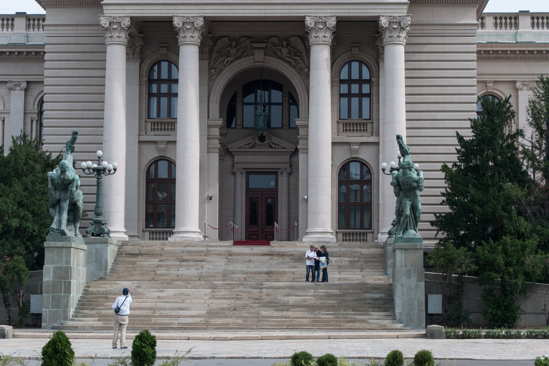 Varios turistas en las escaleras del edificio del Parlamento de Serbia.