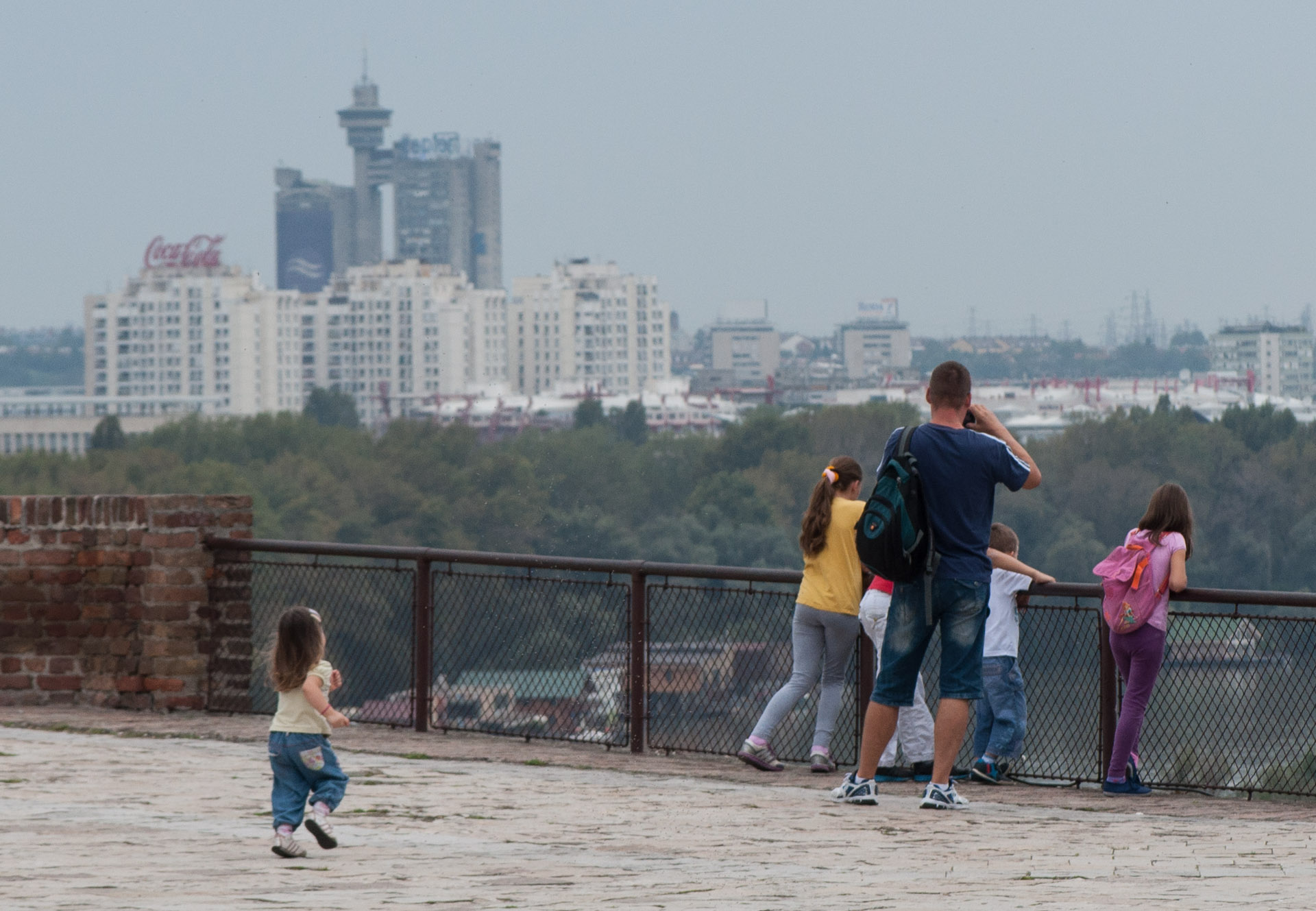 Una familia disfruta de las vistas del Nuevo Belgrado en el mirador desde la fortaleza de Kalemegdan.