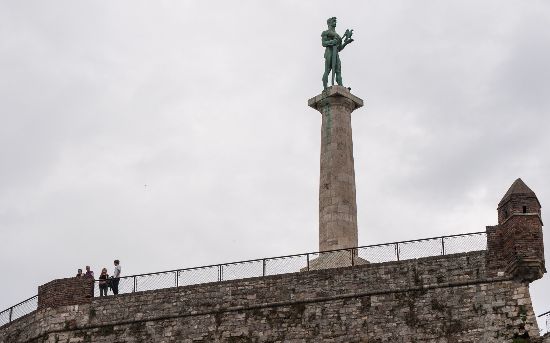 Monumento al Vencedor; una columna culminada por un hombre desnudo con una espada y un halcón en cada mano, convertida en símbolo de la ciudad
