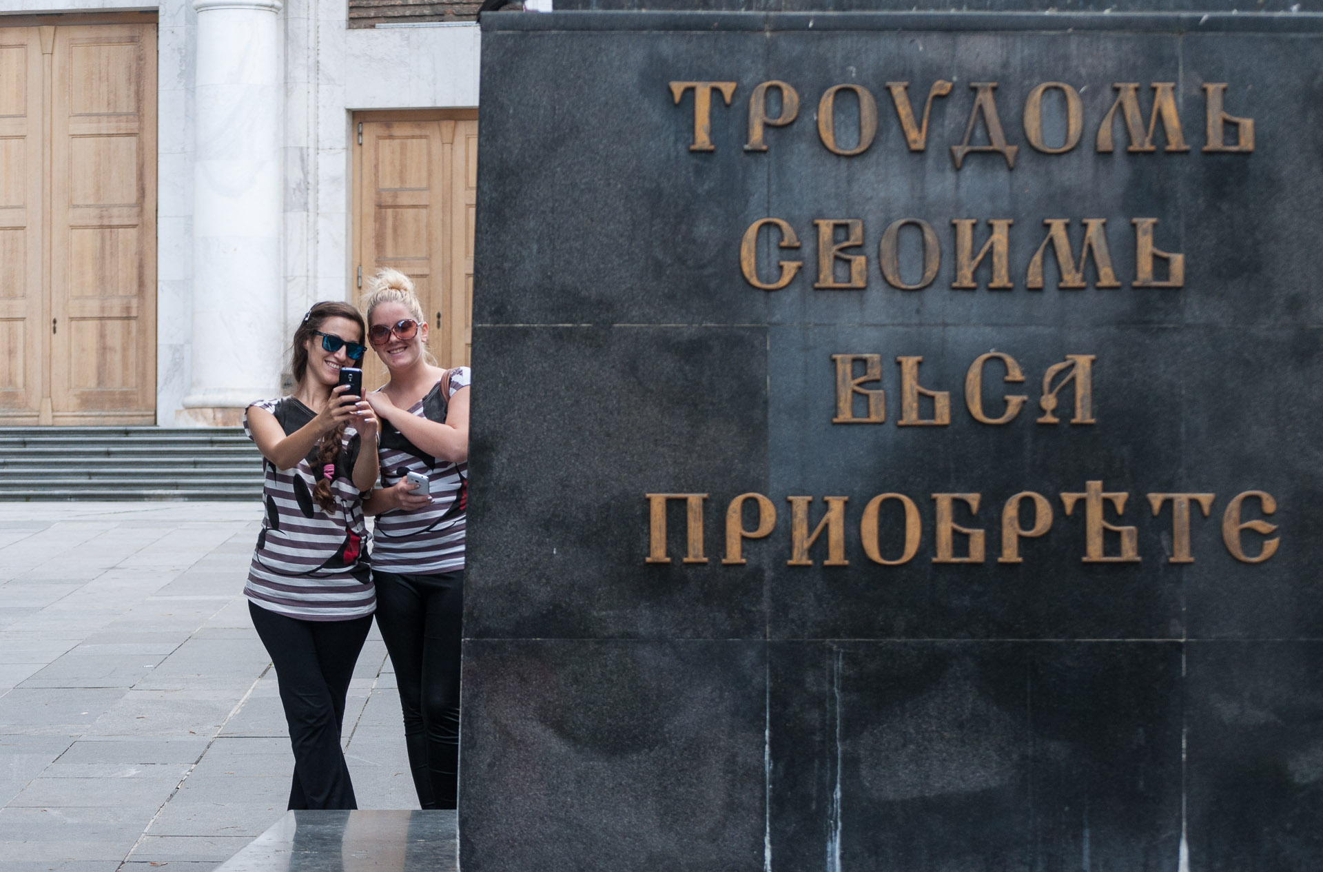 Una pareja de chicas se hacen un selfie al lado de la catedral de San Sava.