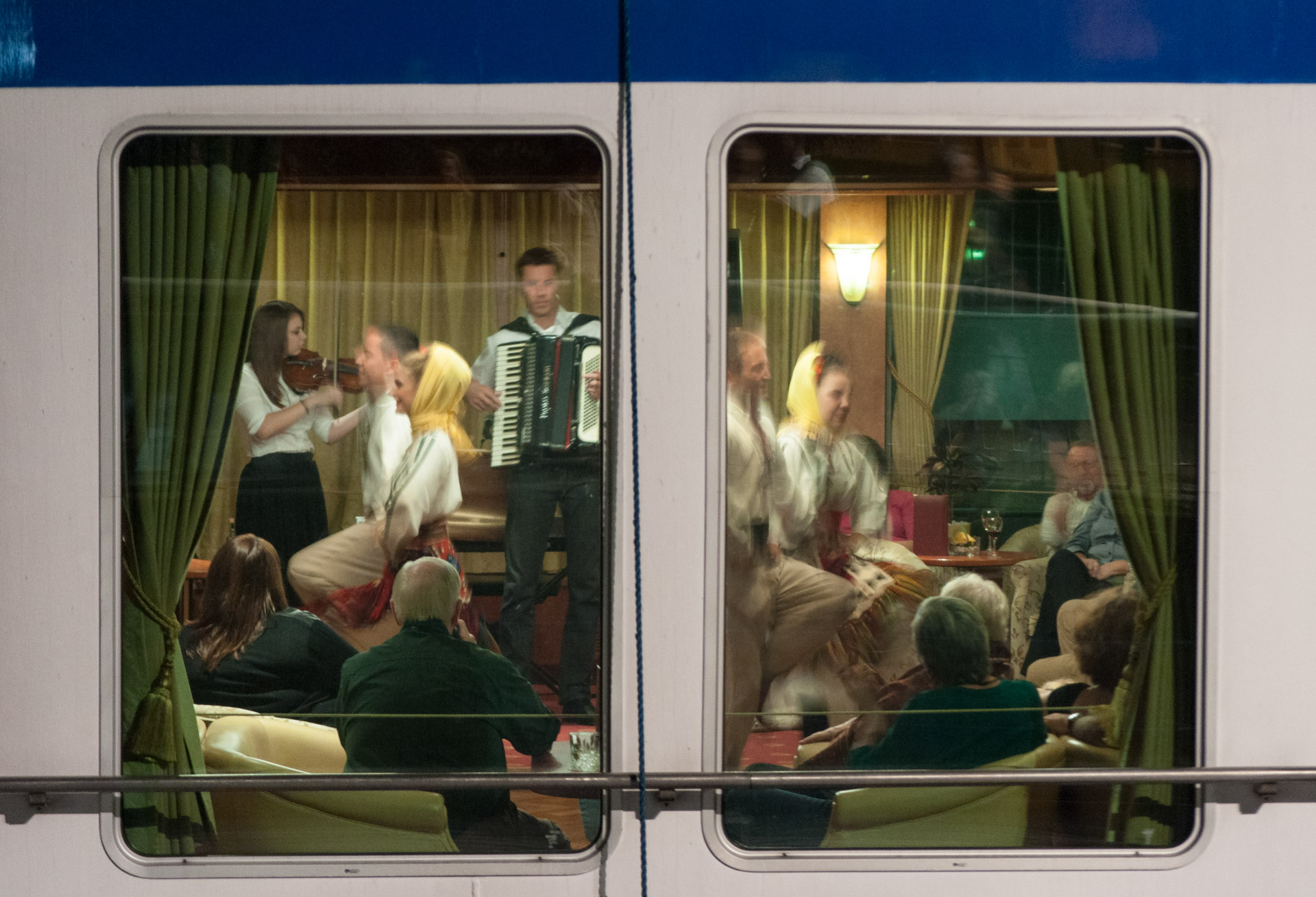 Un grupo folcrórico serbio hace disfrutar a los pasajeros del interior de un barco en la orilla del Danubio.