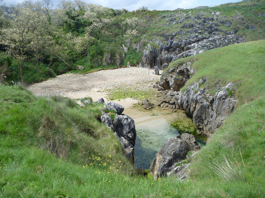 Una de las playas interiores menos conocidas de España. El acceso es complicado aunque se puede llegar facilmente preguntando a los lugareños en el concejo asturiano de Llanes, en el núcleo de Buelna. Con unas dimensiones de 50 metros de longitud y 30 metros de anchura en el interior de la cueva que conecta con el mar, existen estalactitas y estalagmitas.
