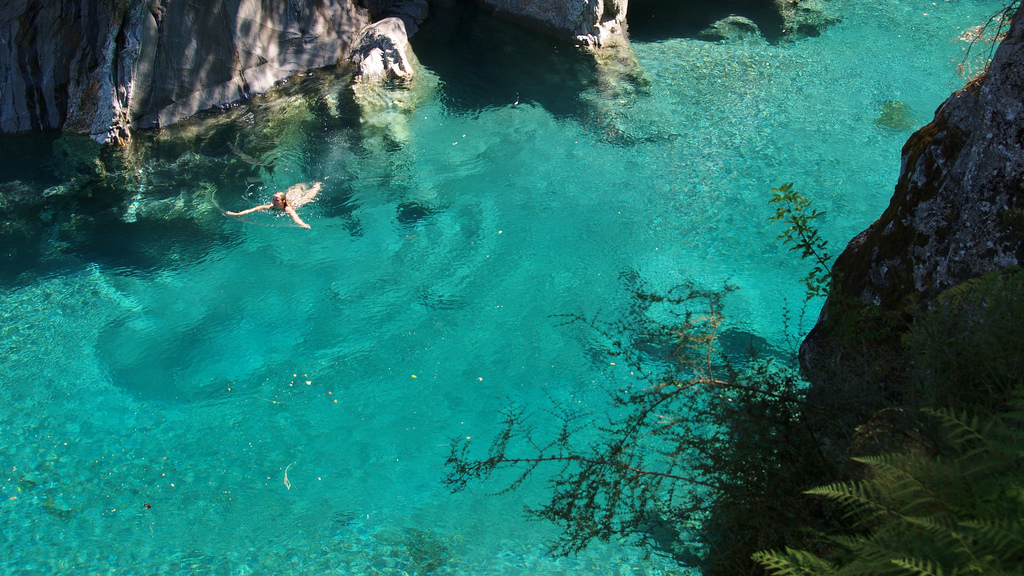 Ubicado en un bosque nativo de hayas, baja desde los glaciares el río Makarora atraviesa un lecho rocoso que da lugar a una serie de piscinas y pozas de intenso color azul turquesa. El agua es tan transparente que cuando está en calma da la sensación de que la personas estuvieran como suspendidas en el aire. Un dato: aunque el baño puede resultar apetecible, el agua está helada.