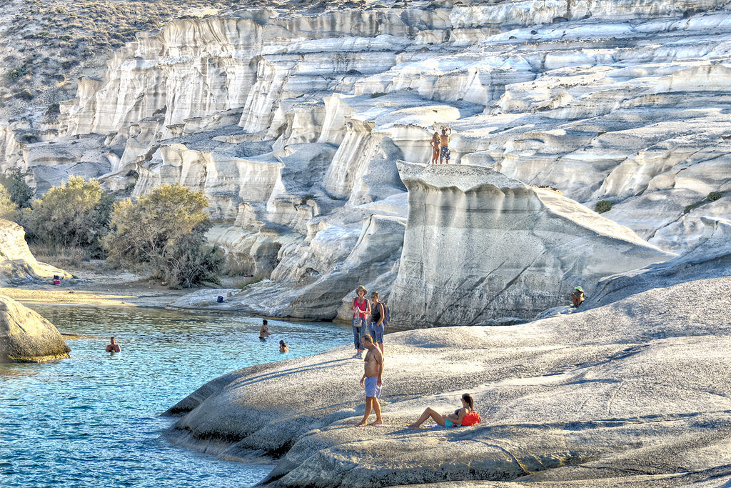 El mar y la erosión ofrecen una perspectiva casi impresionista de uno de los lugares más fotografiados del Mar Egeo. Sarakiniko es una playa de piedra blanca como la nieve y un agua cristalina y transparente como pocas en el mundo. Se trata de un lugar completamente diferente. Dos consejos si la visitan: Imprescindible ir con gafas de sol debido al intenso reflejo de la piedra blanca y el agua está realmente fría.