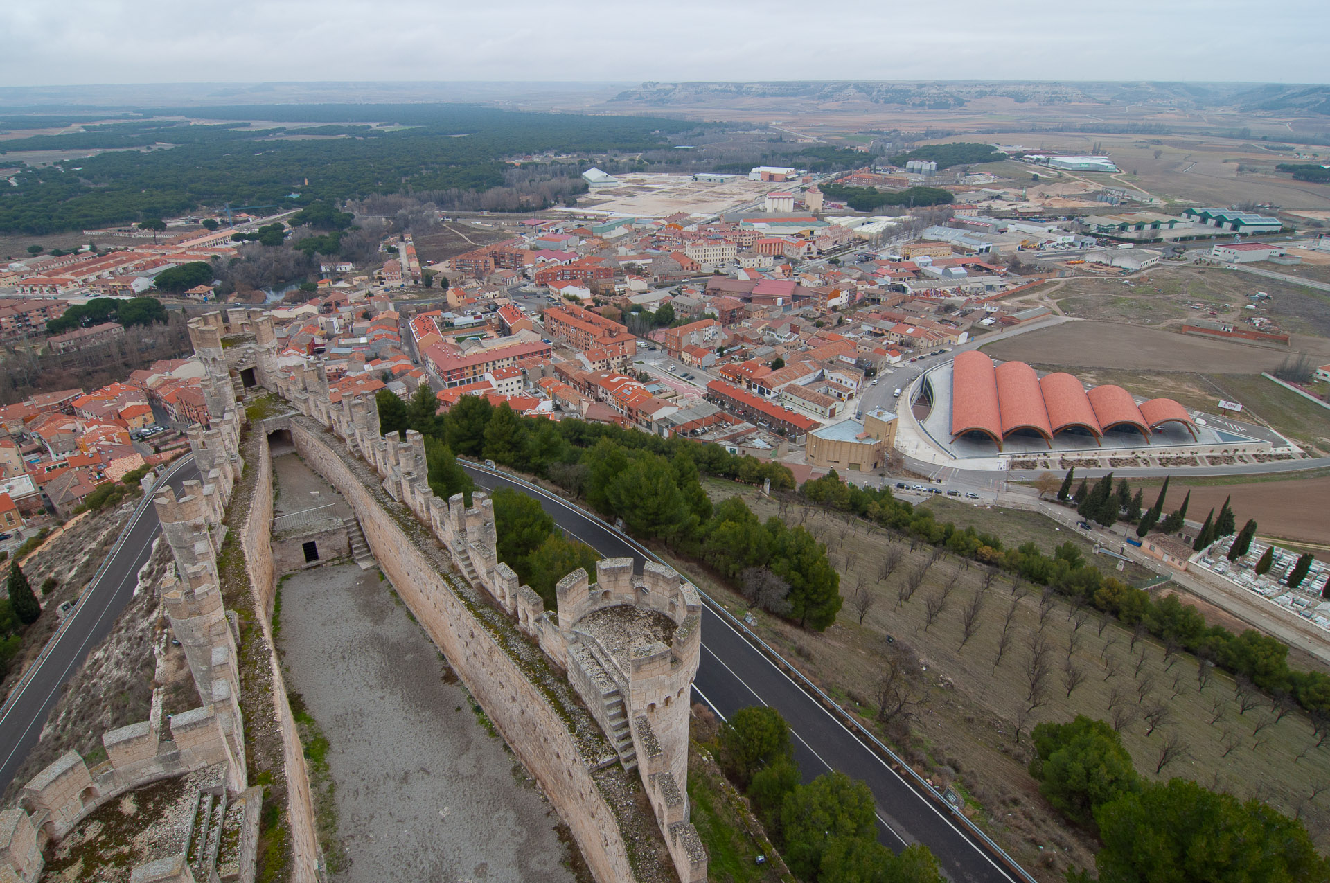 Se acerca la vendimia y eso hace aún más interesante zonas como la Ribera del Duero que ofrecen no sólo la experiencia enológica en viñedos y bodegas -que últimamente se han convertido en un curso de arquitectura moderna- sino también un patrimonio monumental importante como ocurre en Peñafiel, desde cuyo castillo se ha tomado la fotografía en la que vemos, a la derecha, la bodega Protos, obra de Norman Foster