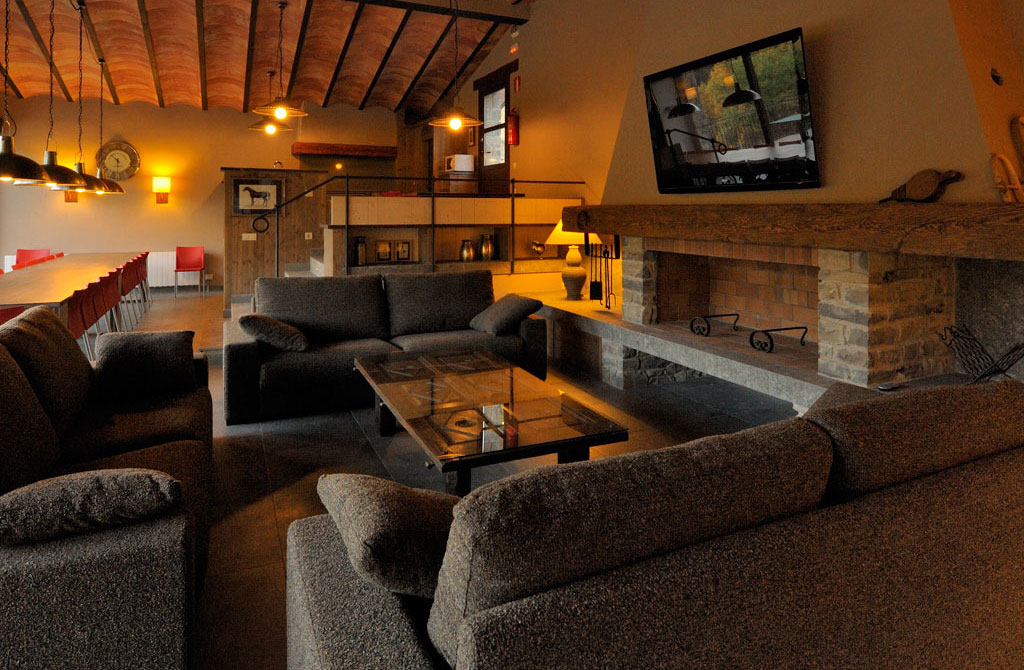 Una chimenea con cierto toque modernista que se sitúa junto a una sala de juegos en la que se podrá jugar, entre otros, al billar y al futbolín. Con ciertos toques en madera esta estancia es de lo más acogedora y muy luminosa debido a las ventanas que rodean la sala. Este alojamiento situado en Girona admite animales y cuenta con una zona de spa en la que se encuentran jacuzzis y cromoterapia. Todo un lujo que despertará todos tus sentidos.
