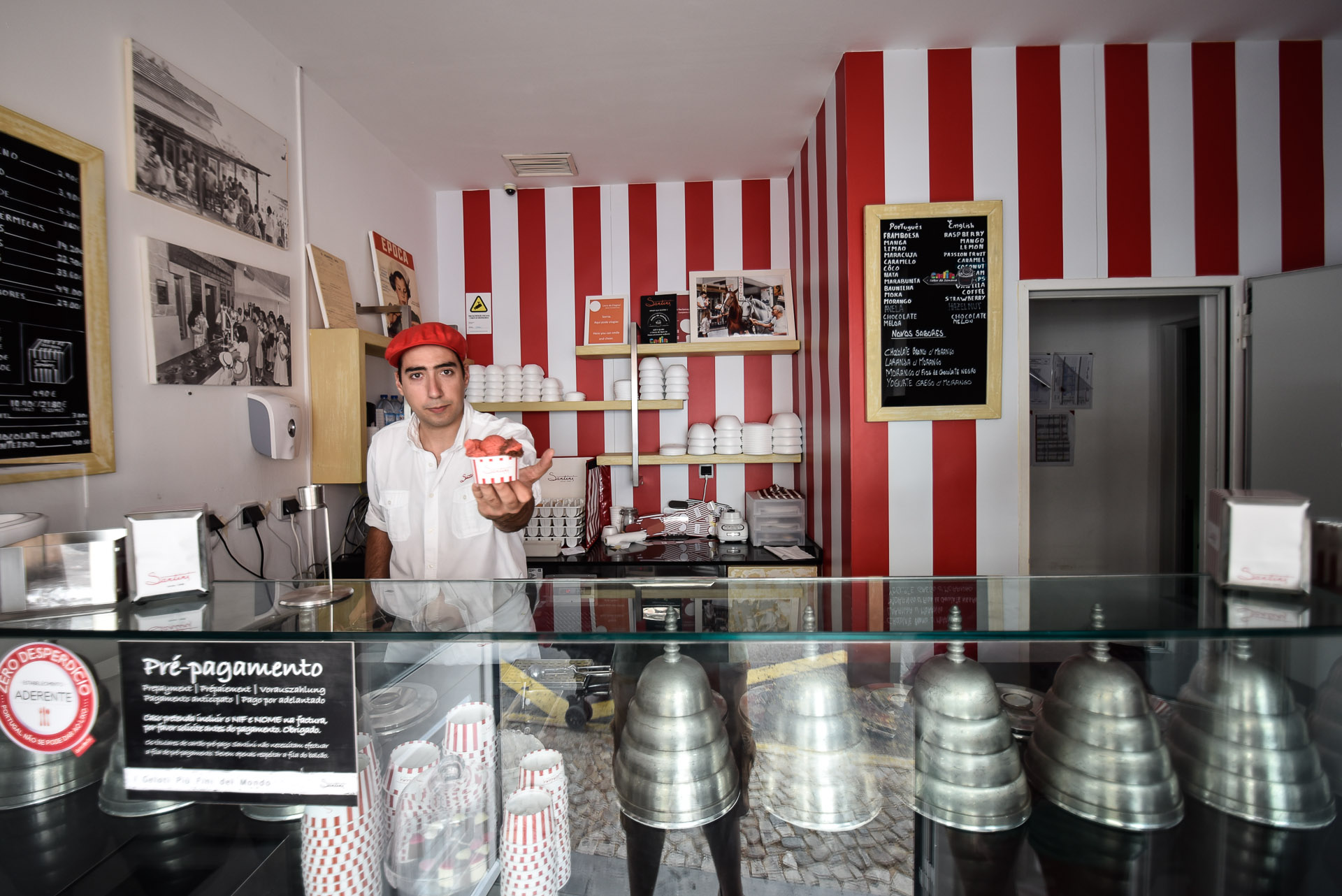 El dueño de la heladería más famosa de Estoril ofrece uno de sus productos.