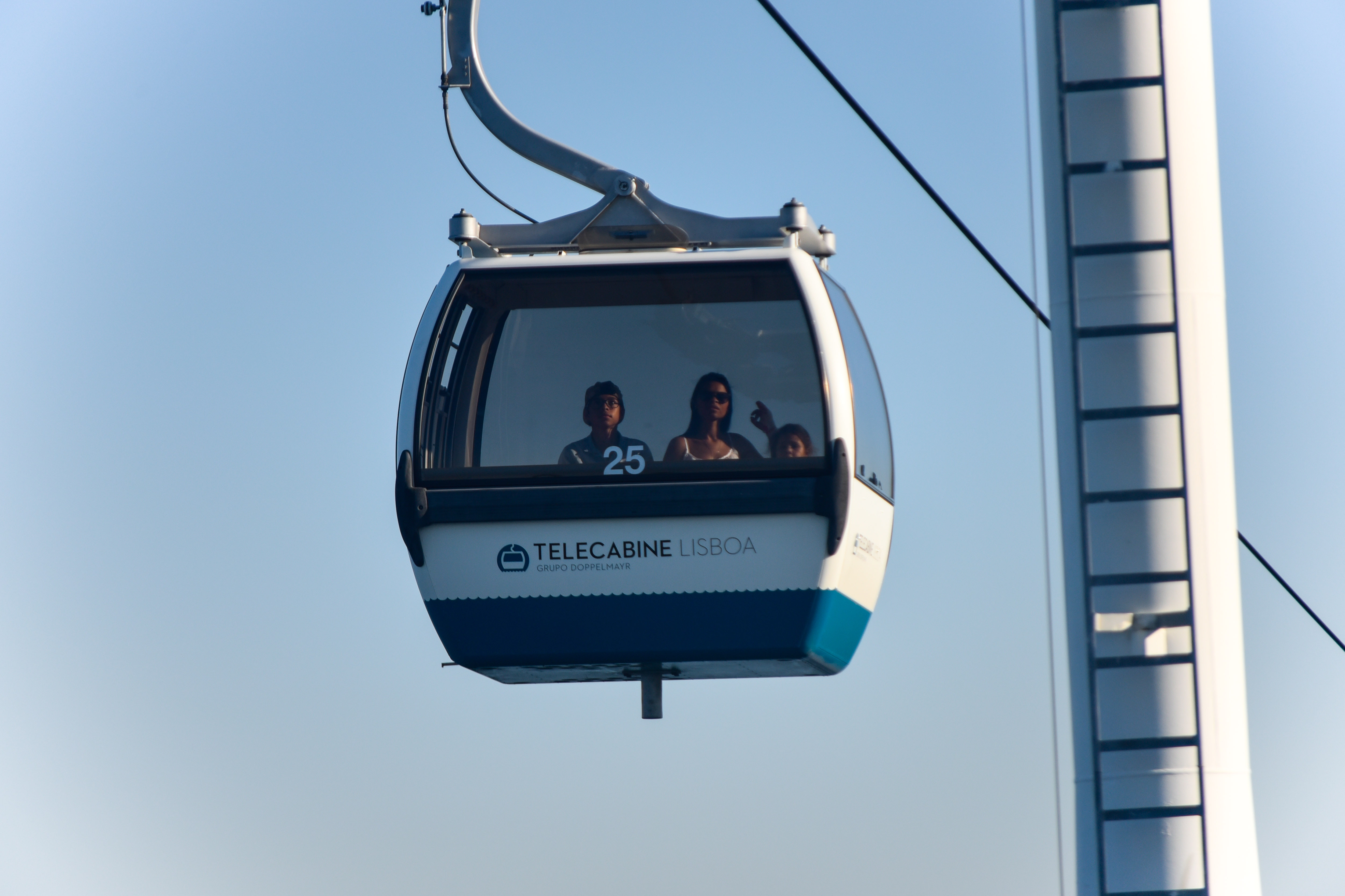 Una madre y sus hijos en el interior de una cabina del Teleférico de Lisboa.