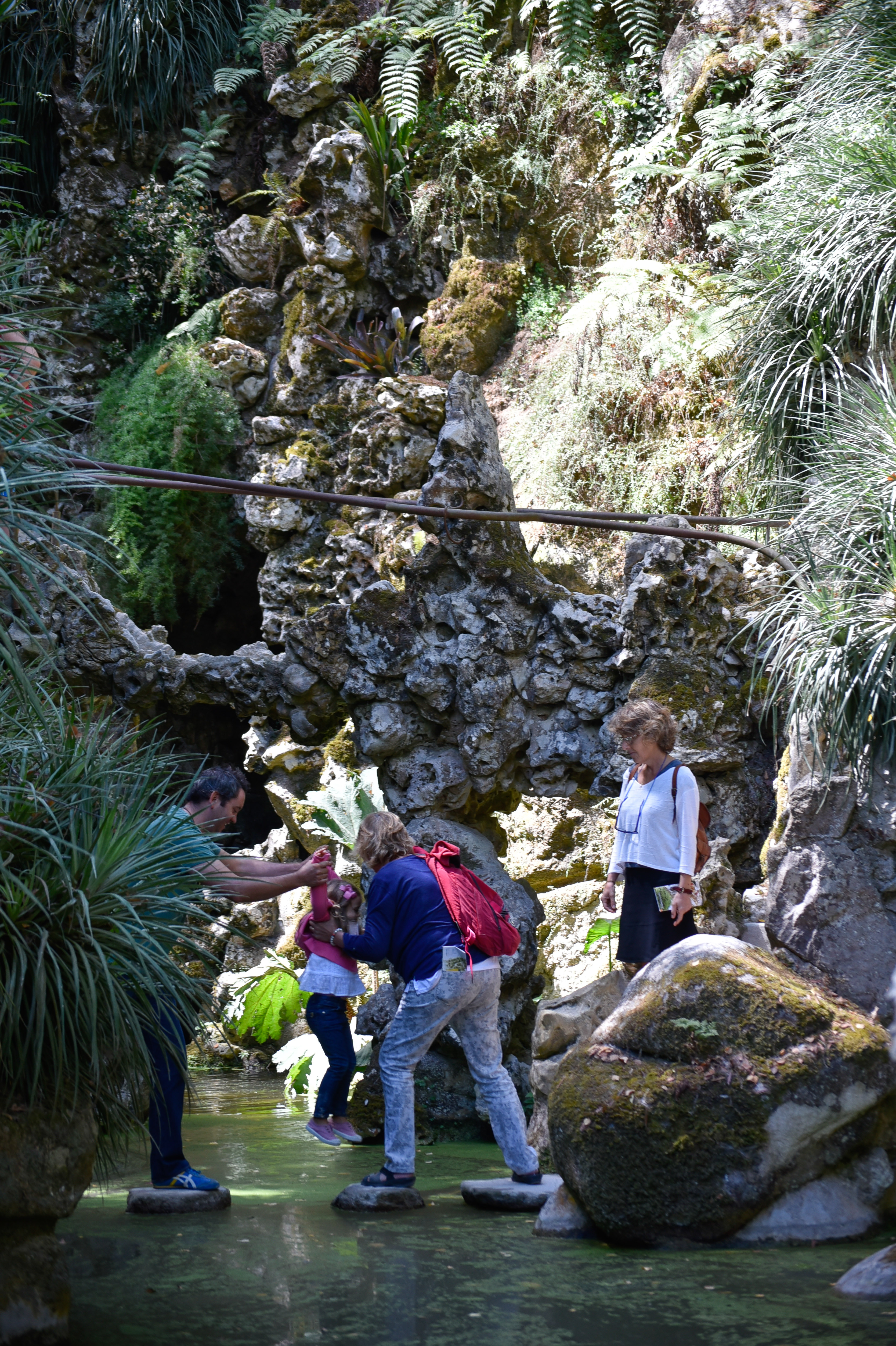 Una niña es ayudada por sus padres para recorrer una de las zonas de la Quinta da Regaleira.