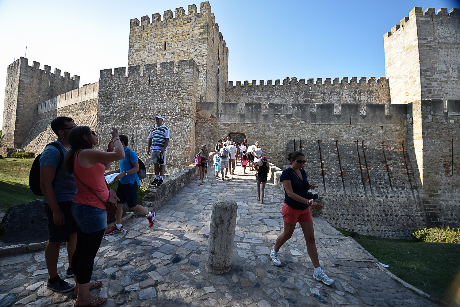 Una madre empuja el carrito de su bebé sobre el suelo pedregoso del Castillo de San Jorge.
