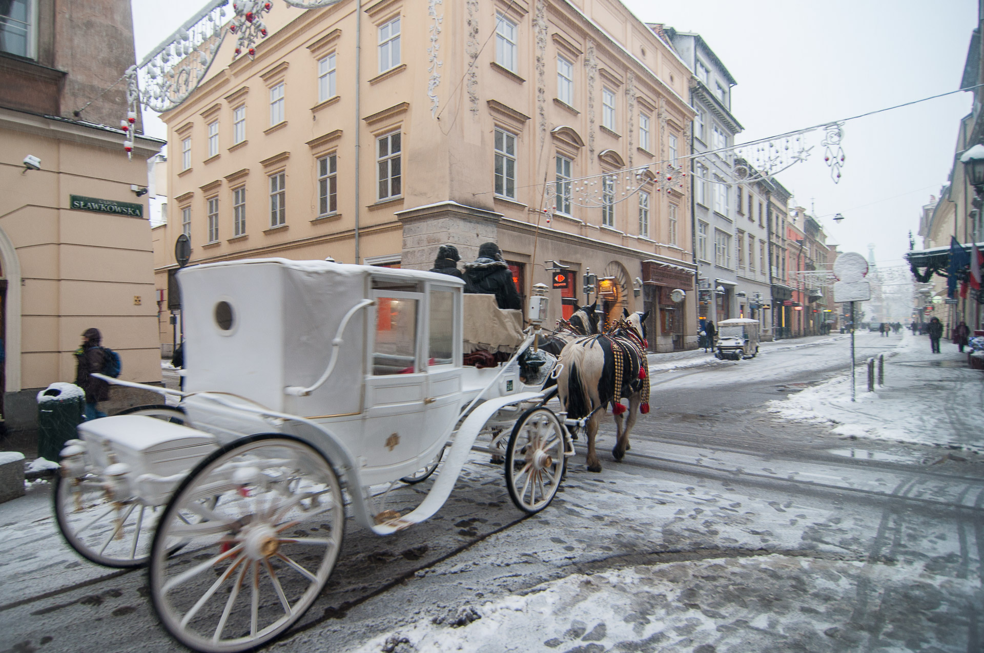 La calle más comercial de Cracovia, junto a la Plaza del Mercado, con uno de los carros para pasear visitantes