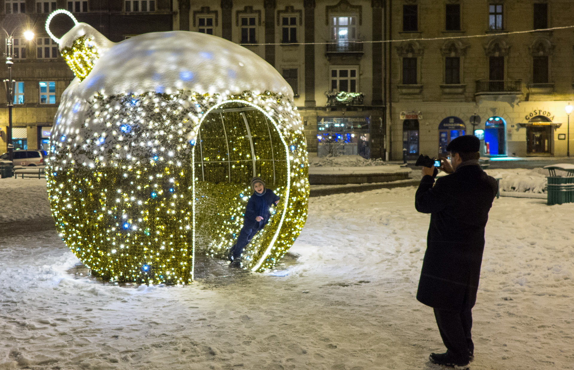 Las decoraciones navideñas se mantienen en Cracovia hasta casi el final de enero, como la extraña y colorida bola de la fotografía