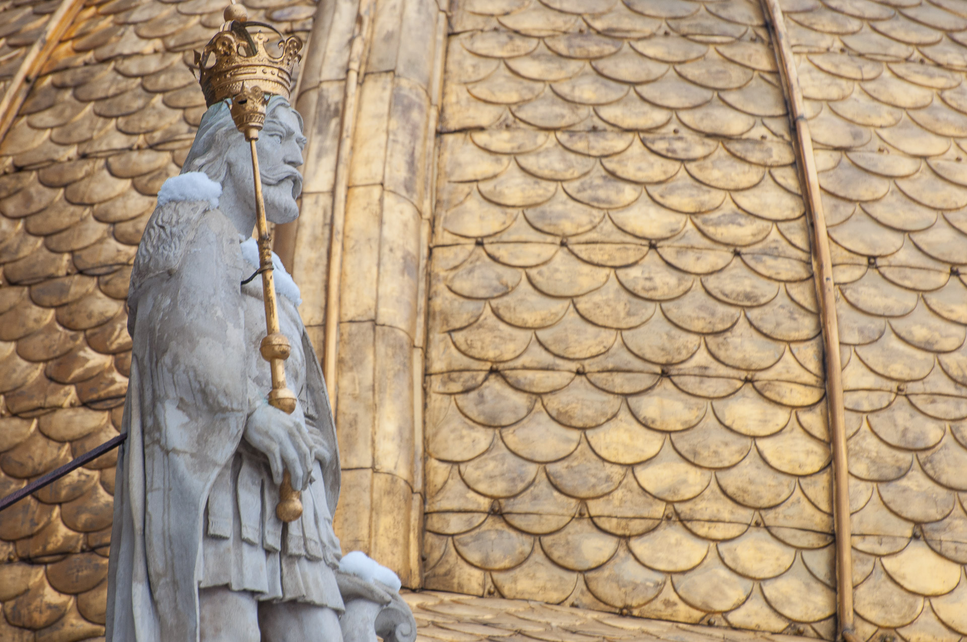 La cúpula dorada de la catedral y una de las estatuas que adornan el techo del templo