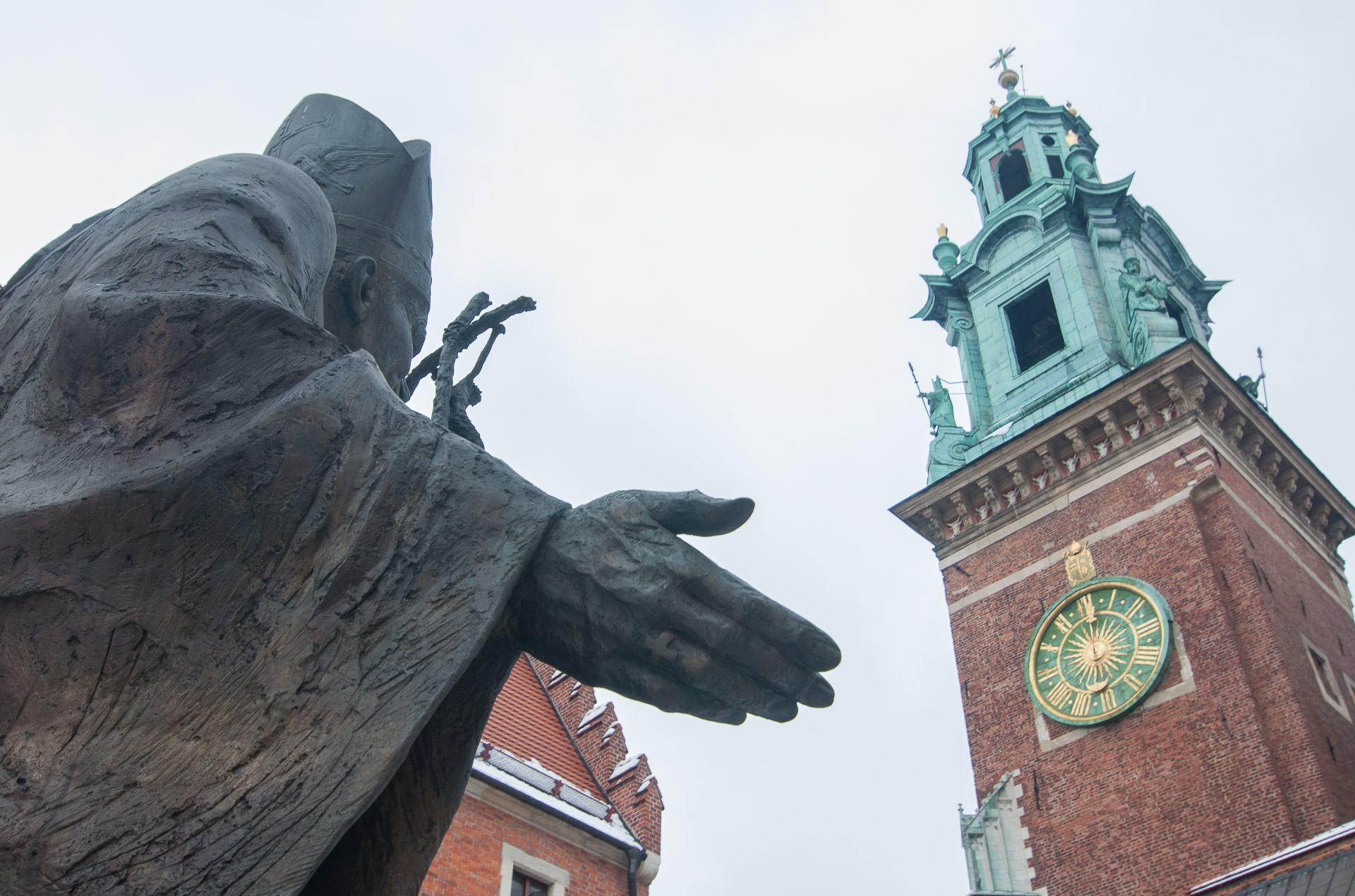 La estatua de Juan Pablo II y una de las torres de la catedral