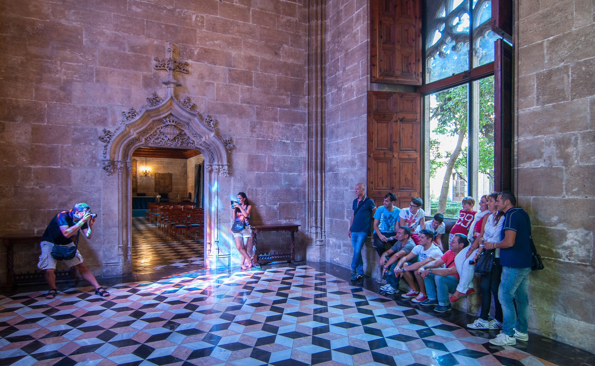 Un grupo de visitantes se fotografía junto a una ventana, bañados por la suave y colorida luz que dejan pasar las antiguas vidrieras de colores