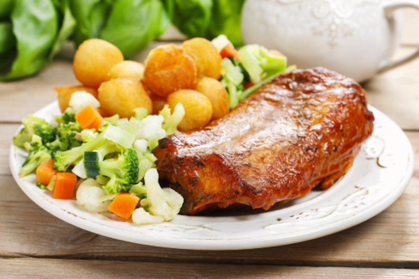 Conejo asado con verduras y bolitas de patata
