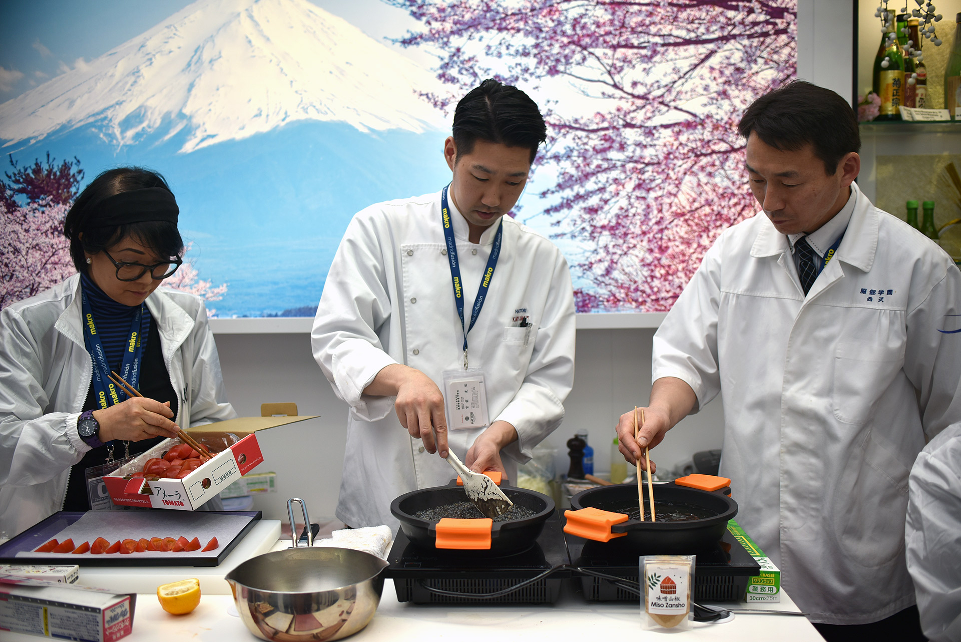 Tres cocineros japoneses demuestran su valía en el stand de Japón, con el monte Fuji de fondo.