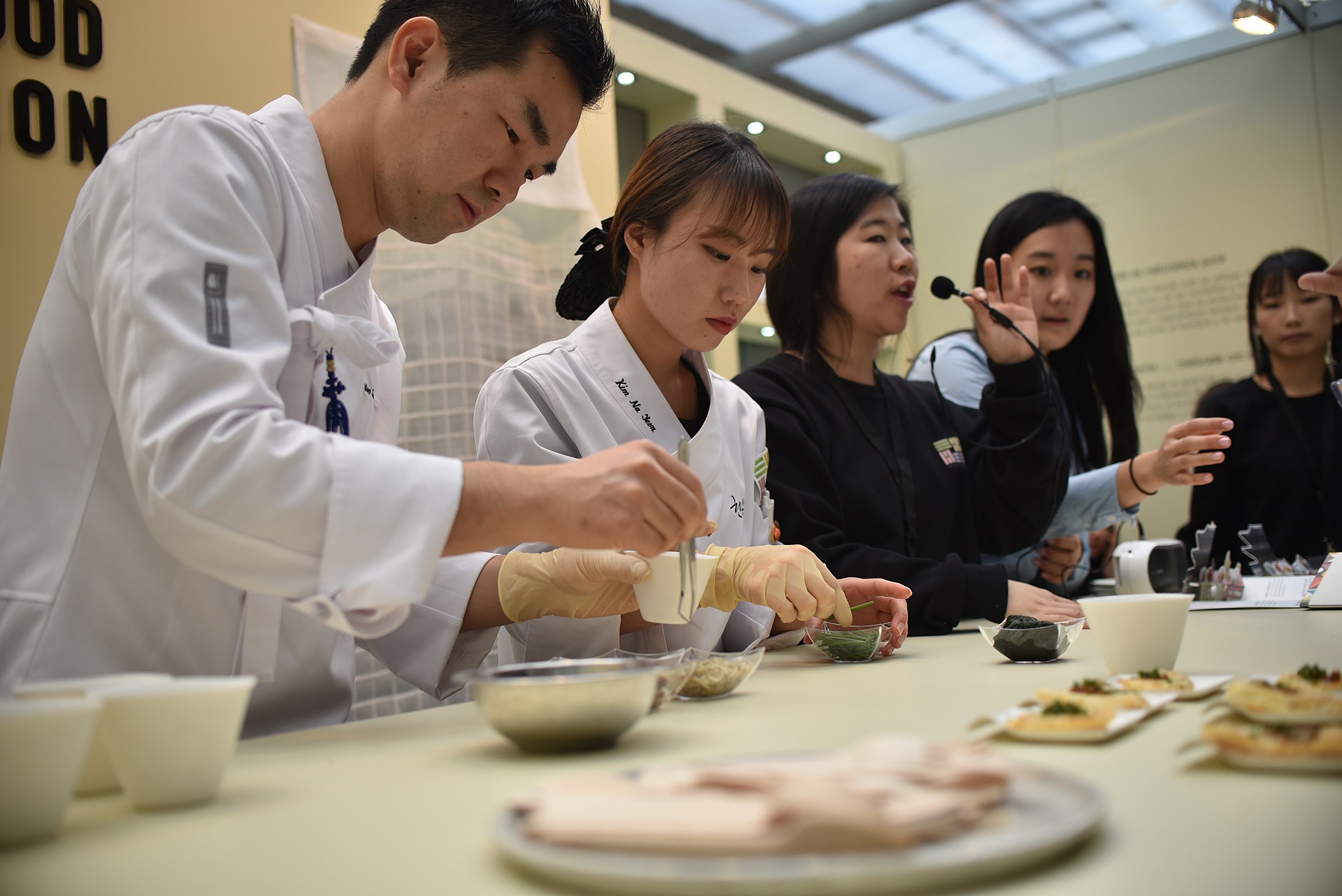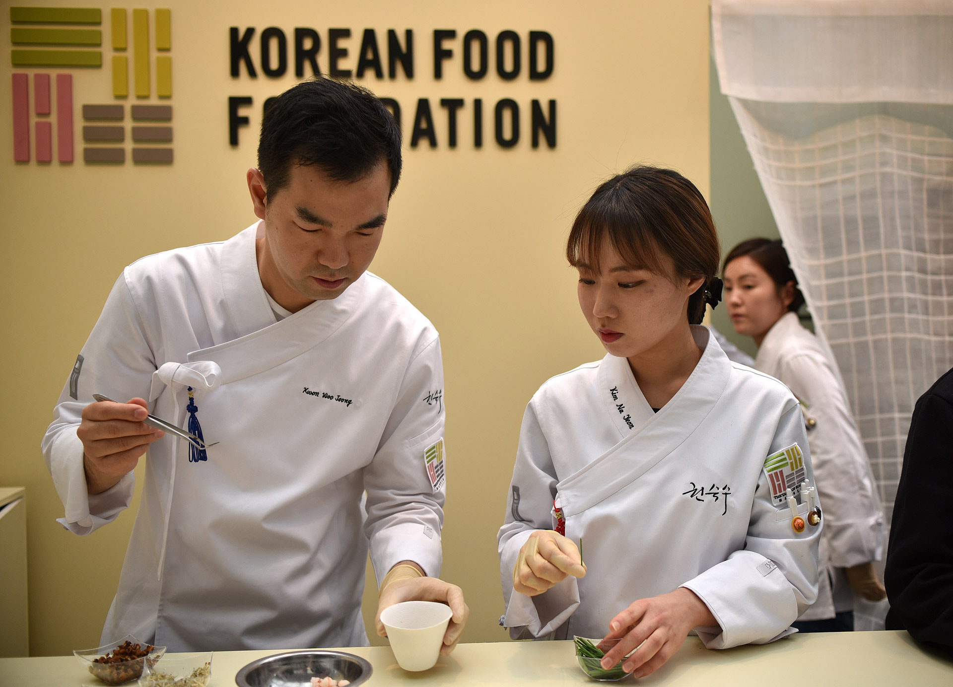 La delicadeza y sutileza de dos cocineros coreanos para preparar uno de sus platos.