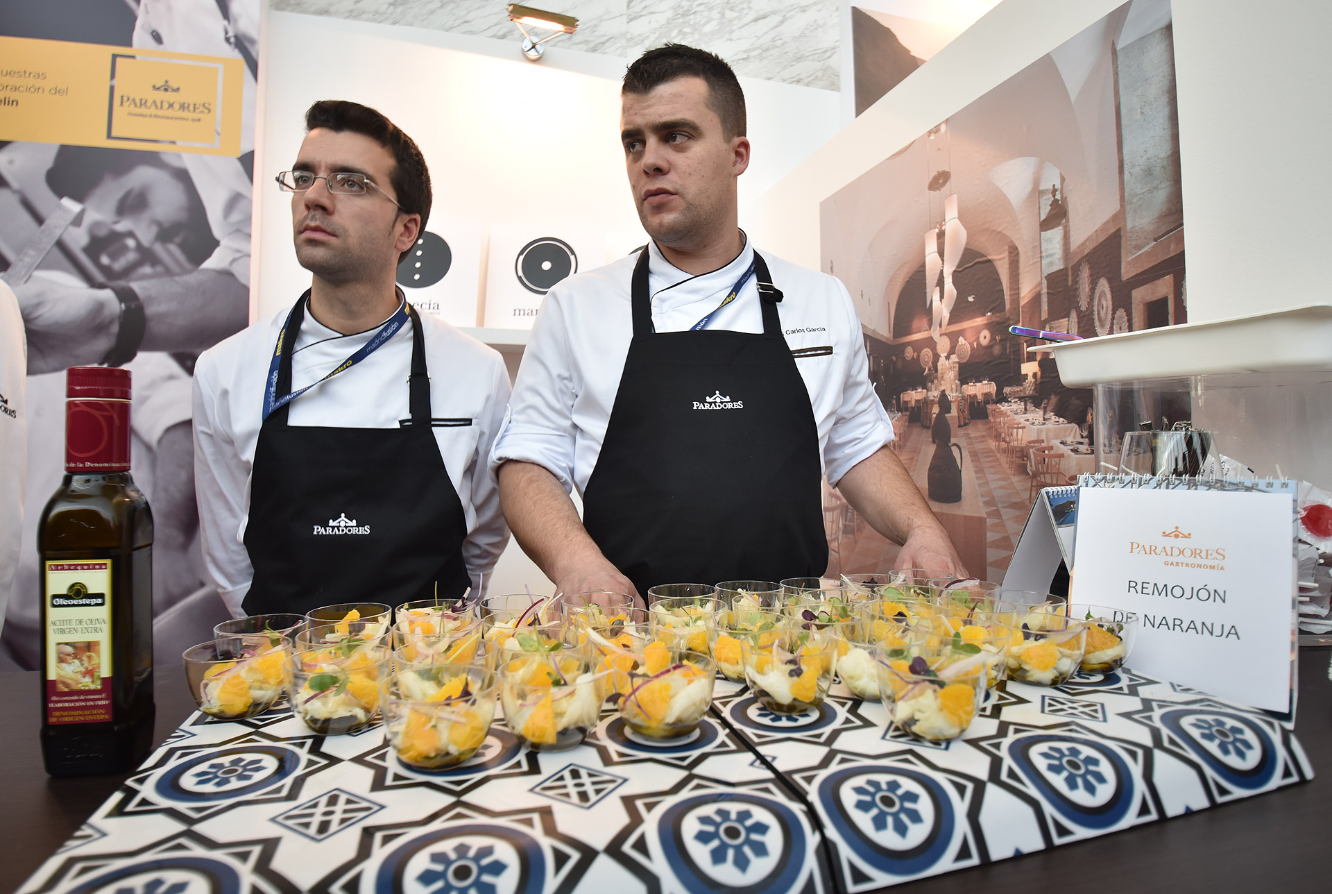 Dos cocineros de Paradores ofreciendo un plato de remojón de naranja.
