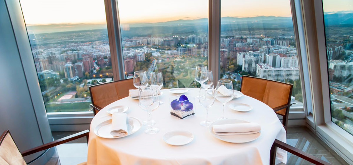 Cena con vistas para la noche más romántica. Ubicado en la planta 33 de la madrileña Torre Espacio, el restaurante más alto de España tiene las mejores vistas de la ciudad y de la sierra. Su cena para el sábado 13 de febrero es un menú exquisito con vino o champagne y de postre chocolate, fresas y oro. Paseo de la Castellana, 259 Madrid.