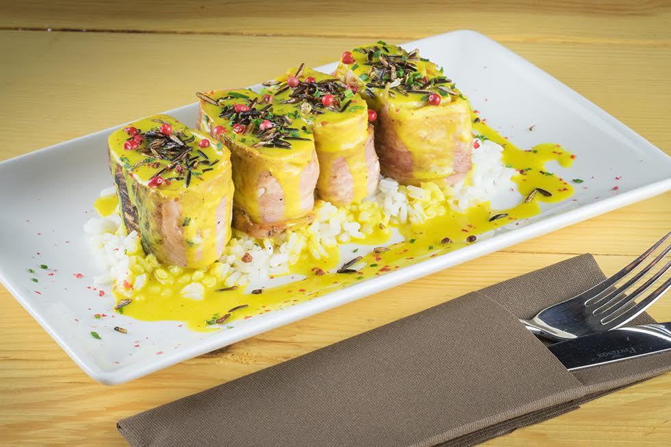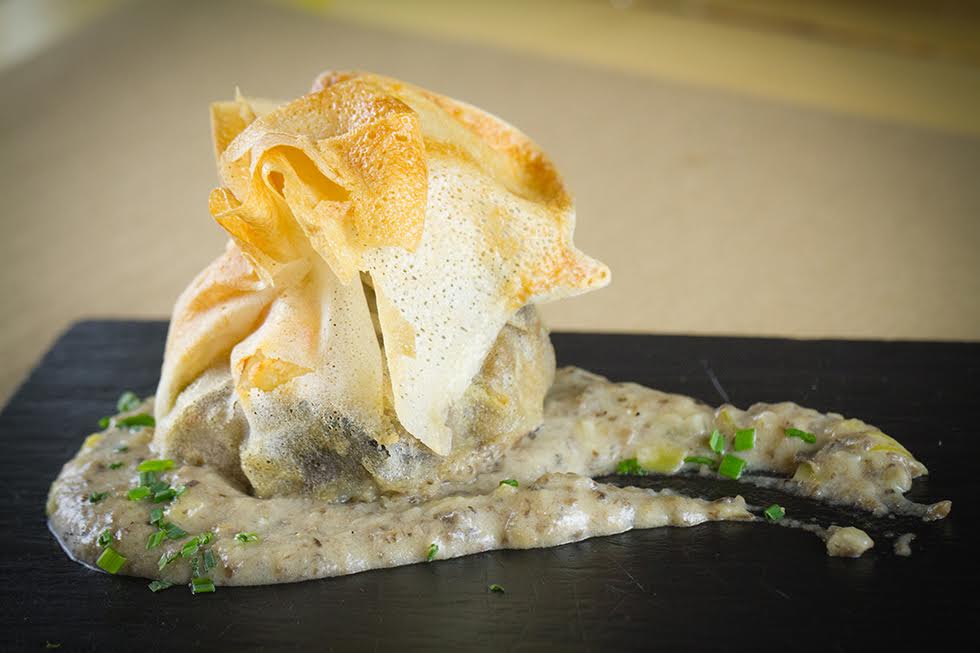 El método es fácil. El local dispone de numerosas pizarras donde podemos escribir nuestra sugerencia, aunque si preferimos las redes sociales, también podemos utilizarlas: tan solo debemos escribir un tuit con el hashtag #MiPlatoTop10 indicando el plato que desearíamos. Si hay más de siete peticiones se dispondrá para que todo comensal pueda disfrutar de él durante algunos meses (con el nombre de quien lo pidió primero). En la imagen, el Saquito de setas y langostinos con salsa trufada de Puerro, donde -a diferencia de otros- lo que destaca es la abundancia de langostino.