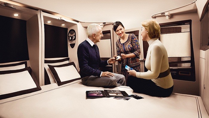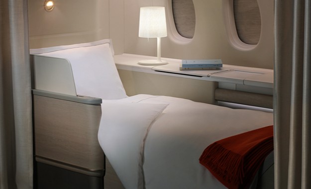 Situada en lo más alto de algunos ránkings del lujo en las nubes, las suites de Singapore Airlines proporcionan intimidad absoluta al pasajero. Diseño francés, amplia butaca de cuero y una espaciosísima cama independiente del asiento son algunas de sus ventajas. El menú, que firman chefs de todo el mundo, puede elegirse con antelación.